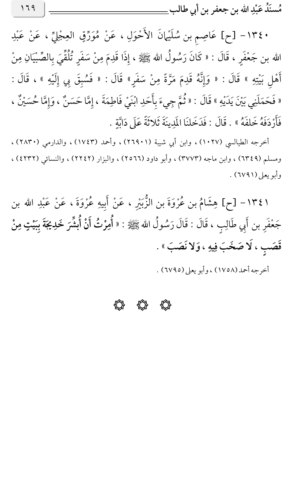 ١٣٤٠ - [ح] عَاصِمِ بن سُلَيْمانَ الأَحْوَلِ، عَنْ مُوَرِّقٍ العِجليِّ، عَنْ عَبْدِ الله بن جَعْفَرٍ، قَالَ: «كَانَ رَسُولُ الله صلى الله عليه وسلم، إِذَا قَدِمَ مِنْ سَفَرٍ تُلُقِّيَ بِالصِّبْيَانِ مِنْ أَهْلِ بَيْتِهِ» قَالَ: «وَإِنَّهُ قَدِمَ مَرَّةً مِنْ سَفَرٍ» قَالَ: «فَسُبِقَ بِي إِلَيْهِ» قَالَ: ، «فَحَمَلَنِي بَيْنَ يَدَيْهِ» قَالَ: «ثُمَّ جِيءَ بِأَحَدِ ابْنَيْ فَاطِمَةَ، إِمَّا حَسَنٌ، وَإِمَّا حُسَيْنٌ، فَأَرْدَفَهُ خَلفَهُ» قَالَ: فَدَخَلنَا المَدِينَةَ ثَلاثَةً عَلَى دَابَّةٍ. .