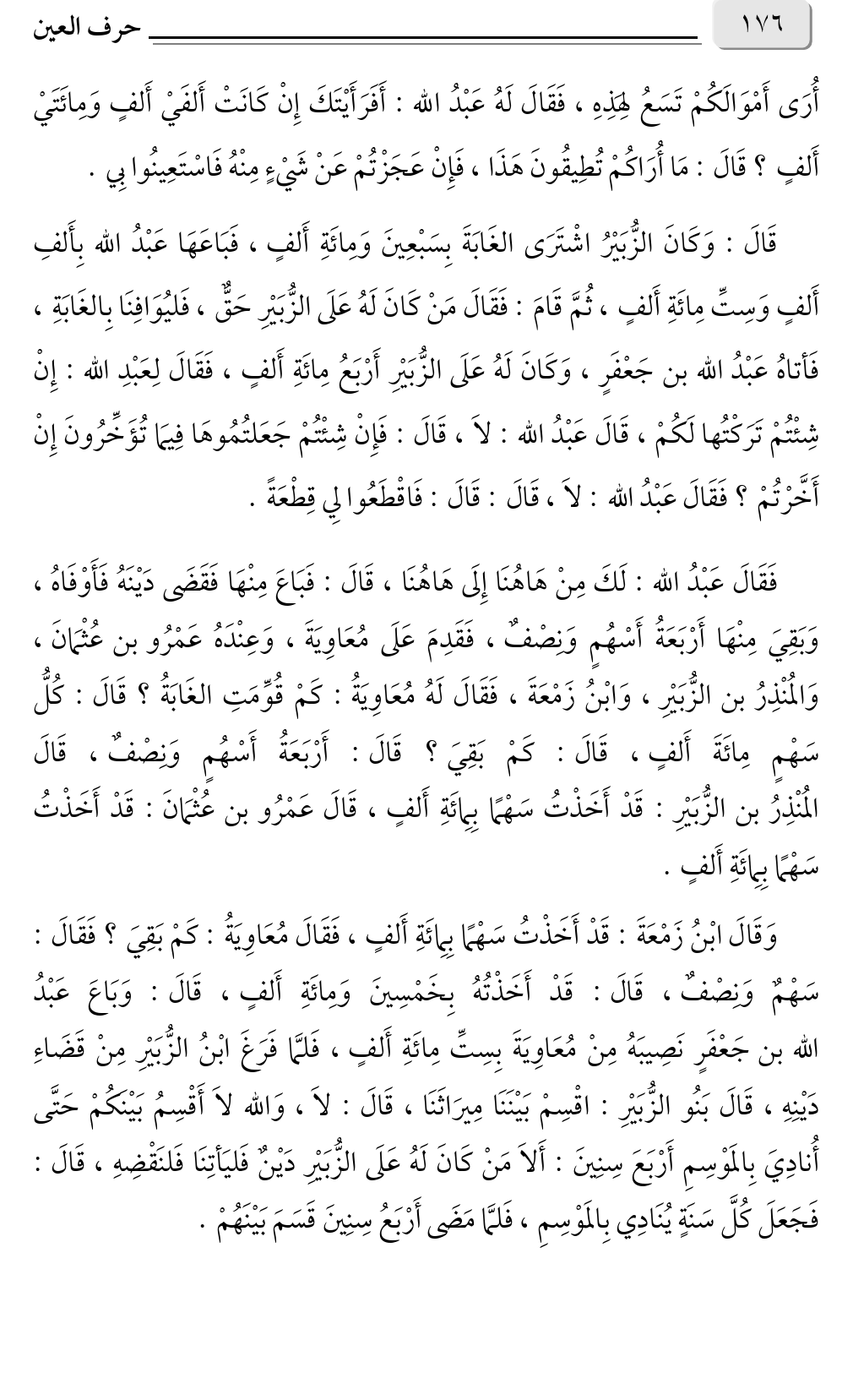 فَقَالَ عَبْدُ الله: لَكَ مِنْ هَاهُنَا إِلَى هَاهُنَا، قَالَ: فَبَاعَ مِنْهَا فَقَضَى دَيْنَهُ فَأَوْفَاهُ، وَبَقِيَ مِنْهَا أَرْبَعَةُ أَسْهُمٍ وَنِصْفٌ، فَقَدِمَ عَلَى مُعَاوِيَةَ، وَعِنْدَهُ عَمْرُو بن عُثْمَانَ، وَالمُنْذِرُ بن الزُّبَيْرِ، وَابْنُ زَمْعَةَ، فَقَالَ لَهُ مُعَاوِيَةُ: كَمْ قُوِّمَتِ الغَابَةُ؟ قَالَ: كُلُّ سَهْمٍ مِائَةَ أَلفٍ، قَالَ: كَمْ بَقِيَ؟ قَالَ: أَرْبَعَةُ أَسْهُمٍ وَنِصْفٌ، قَالَ المُنْذِرُ بن الزُّبَيْرِ: قَدْ أَخَذْتُ سَهْمًا بِمِائَةِ أَلفٍ، قَالَ عَمْرُو بن عُثْمَانَ: قَدْ أَخَذْتُ سَهْمًا بِمِائَةِ أَلفٍ.
