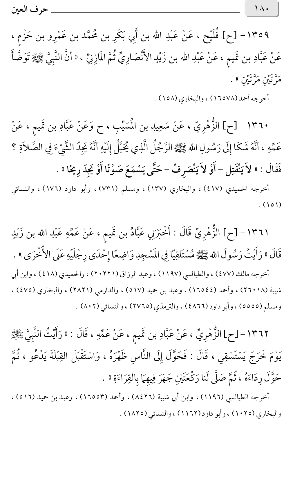١٣٥٩ - [ح] فُلَيْح، عَنْ عَبْدِ الله بن أَبِي بَكْرِ بن مُحمَّد بن عَمْرِو بن حَزْمٍ، ، عَنْ عَبَّادِ بن تَميمٍ، عَنْ عَبْدِ الله بن زَيْدٍ الأَنْصَارِيِّ ثُمَّ المَازِنِيِّ «أنَّ النَّبِيَّ صلى الله عليه وسلم تَوَضَّأَ مَرَّتَيْنِ مَرَّتَيْنِ».