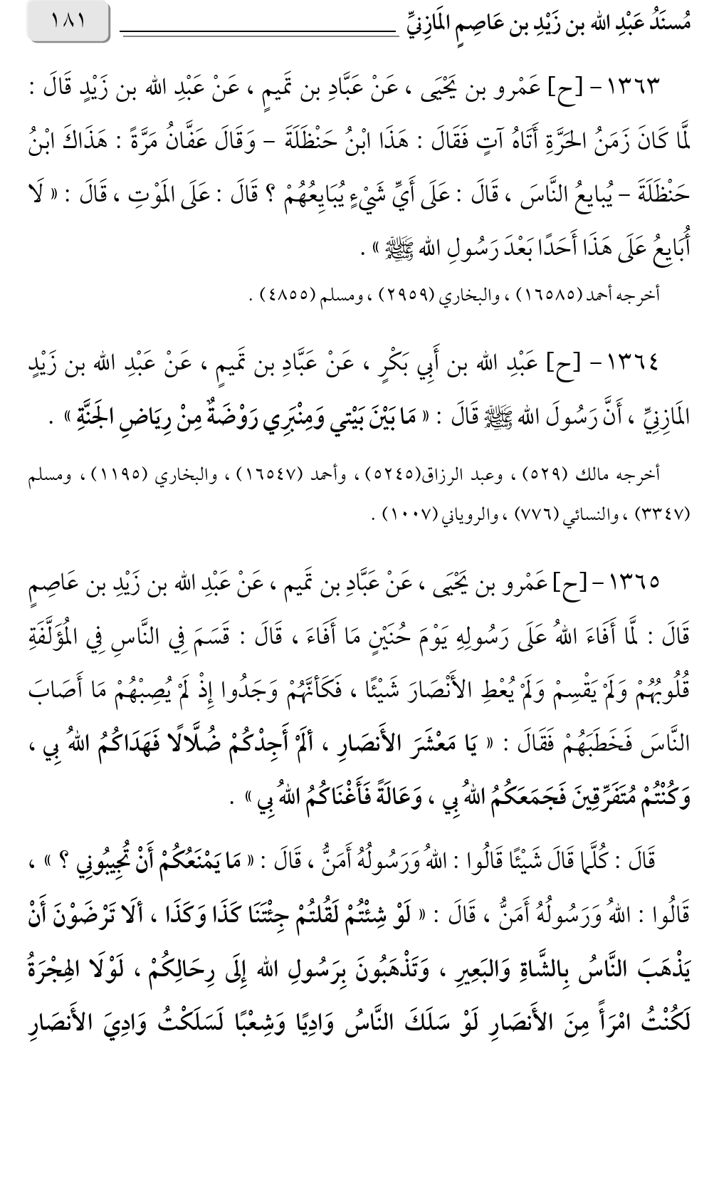 ١٣٦٤ - [ح] عَبْدِ الله بن أَبِي بَكْرٍ، عَنْ عَبَّادِ بن تَميمٍ، عَنْ عَبْدِ الله بن زَيْدٍ المَازِنِيِّ، أَنَّ رَسُولَ الله صلى الله عليه وسلم قَالَ: «مَا بَيْنَ بَيْتي وَمِنْبَرِي رَوْضَةٌ مِنْ رِيَاضِ الجَنَّةِ».