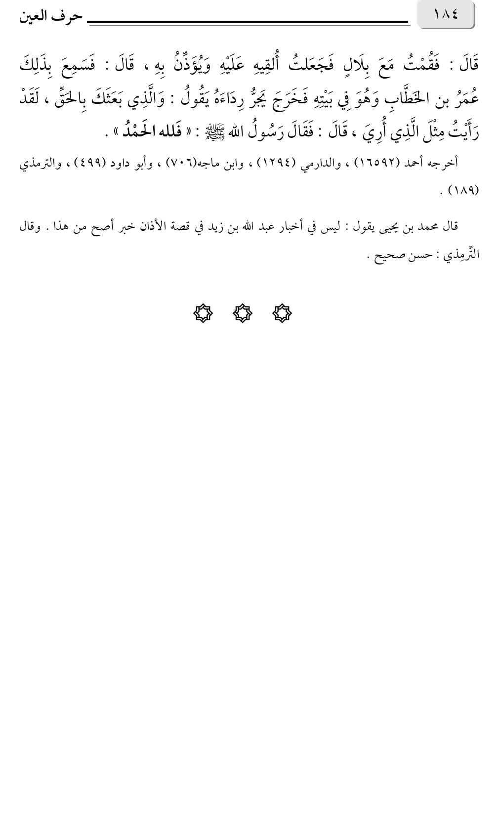 قَالَ: فَقُمْتُ مَعَ بِلَالٍ فَجَعَلتُ أُلقِيهِ عَلَيْهِ وَيُؤَذِّنُ بِهِ، قَالَ: فَسَمِعَ بِذَلِكَ عُمَرُ بن الخَطَّابِ وَهُوَ فِي بَيْتِهِ فَخَرَجَ يَجرُّ رِدَاءَهُ يَقُولُ: وَالَّذِي بَعَثَكَ بِالحَقِّ، لَقَدْ رَأَيْتُ مِثْلَ الَّذِي أُرِيَ، قَالَ: فَقَالَ رَسُولُ الله صلى الله عليه وسلم: «فَلله الحَمْدُ».