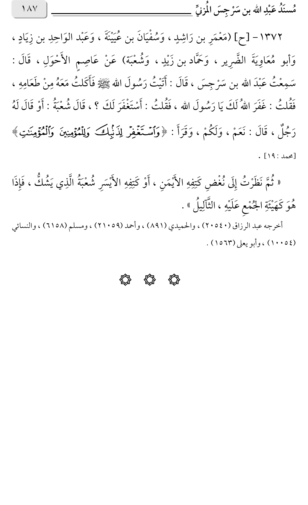 ١٣٧٢ - [ح] (مَعْمَرِ بن رَاشِدٍ، وَسُفْيَانَ بن عُيَيْنَةَ، وَعَبْد الوَاحِدِ بن زِيَادٍ، وَأبو مُعَاوِيَةَ الضَّرِير، وَحَمَّاد بن زَيْدٍ، وَشُعْبَة) عَنْ عَاصِمٍ الأَحْوَلِ، قَالَ: سَمِعْتُ عَبْدَ الله بن سَرْجِسَ، قَالَ: أَتَيْتُ رَسُولَ الله صلى الله عليه وسلم فَأَكَلتُ مَعَهُ مِنْ طَعَامِهِ، فَقُلتُ: غَفَرَ اللهُ لَكَ يَا رَسُولَ الله، فَقُلتُ: أَسْتَغْفَرَ لَكَ؟ ، قَالَ شُعْبَةُ: أَوْ قَالَ لَهُ رَجُلٌ، قَالَ: نَعَمْ، وَلَكُمْ، وَقَرَأَ {وَاسْتَغْفِرْ لِذَنْبِكَ وَلِلْمُؤْمِنِينَ وَالْمُؤْمِنَاتِ} [محمد: ١٩].