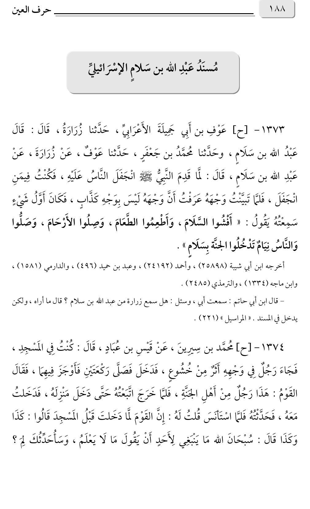 ١٣٧٣ - [ح] عَوْفِ بن أَبِي جَمِيلَةَ الأَعْرَابِيِّ، حَدَّثنا زُرَارَةُ، قَالَ: قَالَ عَبْدُ الله بن سَلَامٍ، وحَدَّثنا مُحمَّدُ بن جَعْفَرٍ، حَدَّثنا عَوْفٌ، عَنْ زُرَارَةَ، عَنْ عَبْدِ الله بن سَلَامٍ، قَالَ: لمَّا قَدِمَ النَّبِيُّ صلى الله عليه وسلم انْجَفَلَ النَّاسُ عَلَيْهِ، فَكُنْتُ فِيمَنِ انْجَفَلَ، فَلمَّا تَبيَّنْتُ وَجْهَهُ عَرَفْتُ أَنَّ وَجْهَهُ لَيْسَ بِوَجْهِ كَذَّابٍ، فَكَانَ أَوَّلُ شَيْءٍ سَمِعْتُهُ يَقُولُ: «أَفْشُوا السَّلَامَ، وَأَطْعِمُوا الطَّعَامَ، وَصِلُوا الأَرْحَامَ، وَصَلُّوا وَالنَّاسُ نِيَامٌ تَدْخُلُوا الجنَّة بِسَلَامٍ».
