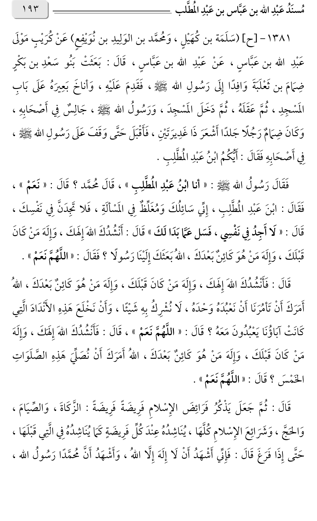 قَالَ: فَأَنْشُدُكَ اللهَ إِلَهكَ، وَإِلَهَ مَنْ كَانَ قَبْلَكَ، وَإِلَهَ مَنْ هُوَ كَائِنٌ بَعْدَكَ، اللهُ أَمَرَكَ أَنْ تَأمُرَنَا أَنْ نَعْبُدَهُ وَحْدَهُ، لَا نُشْرِكُ بِهِ شَيْئًا، وَأَنْ نَخْلَعَ هَذِهِ الأَنْدَادَ الَّتِي كَانَتْ آبَاؤُنَا يَعْبُدُونَ مَعَهُ؟ قَالَ: «اللَّهُمَّ نَعَمْ» قَالَ: فَأَنْشُدُكَ اللهَ إِلَهَكَ، وَإِلَهَ، مَنْ كَانَ قَبْلَكَ، وَإِلَهَ مَنْ هُوَ كَائِنٌ بَعْدَكَ، اللهُ أَمَرَكَ أَنْ نُصَلِّيَ هَذِهِ الصَّلَوَاتِ الخَمْسَ؟ قَالَ: «اللَّهُمَّ نَعَمْ».