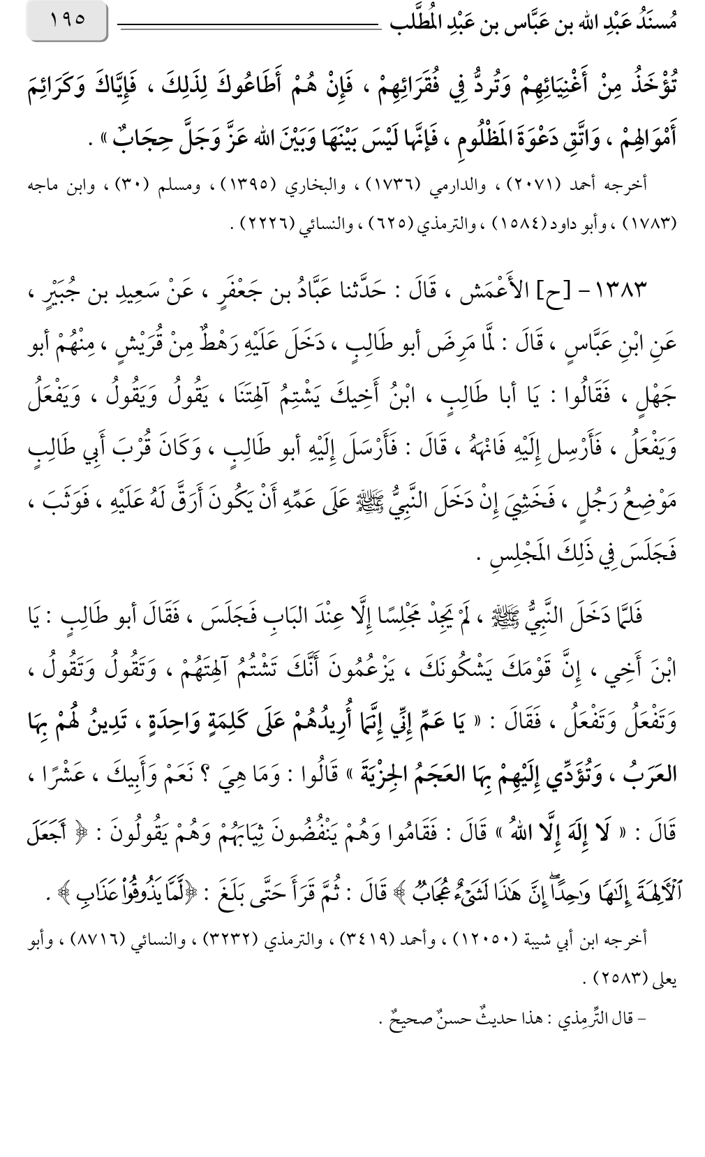 ١٣٨٣ - [ح] الأَعْمَش، قَالَ: حَدَّثنا عَبَّادُ بن جَعْفَرٍ، عَنْ سَعِيدِ بن جُبَيْرٍ، عَنِ ابْنِ عَبَّاسٍ، قَالَ: لمَّا مَرِضَ أبو طَالِبٍ، دَخَلَ عَلَيْهِ رَهْطٌ مِنْ قُرَيْشٍ، مِنْهُمْ أبو جَهْلٍ، فَقَالُوا: يَا أبا طَالِبٍ، ابْنُ أَخِيكَ يَشْتِمُ آلهِتَنَا، يَقُولُ وَيَقُولُ، وَيَفْعَلُ وَيَفْعَلُ، فَأَرْسِل إِلَيْهِ فَانْهَهُ، قَالَ: فَأَرْسَلَ إِلَيْهِ أبو طَالِبٍ، وَكَانَ قُرْبَ أَبِي طَالِبٍ مَوْضِعُ رَجُلٍ، فَخَشِيَ إِنْ دَخَلَ النَّبِيُّ صلى الله عليه وسلم عَلَى عَمِّهِ أَنْ يَكُونَ أَرَقَّ لَهُ عَلَيْهِ، فَوَثَبَ، فَجَلَسَ فِي ذَلِكَ المَجْلِسِ.
