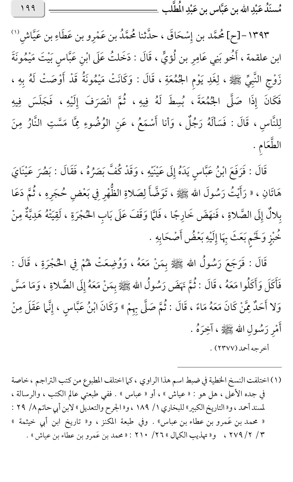 (¬١) اختلفت النسخ الخطية في ضبط اسم هذا الراوي، كما اختلف المطبوع من كتب التراجم، خاصة في جده الأعلى، هل هو: «عياش» أو، «عباس». ففي طبعتي عالم الكتب، والرسالة، لمسند أحمد، و «التاريخ الكبير» للبخاري ١/ ١٨٩، «الجرح والتعديل»: لابن أبي حاتم ٨/ ٢٩: «محمد بن عَمرو بن عطاء بن عباس» وفي طبعة المكنز، و «تاريخ ابن أبي خيثمة» ٣/ ٢/ ٢٧٩ و «تهذيب الكمال» ٢٦/ ٢١٠: «محمد بن عَمرو بن عطاء بن عياش».