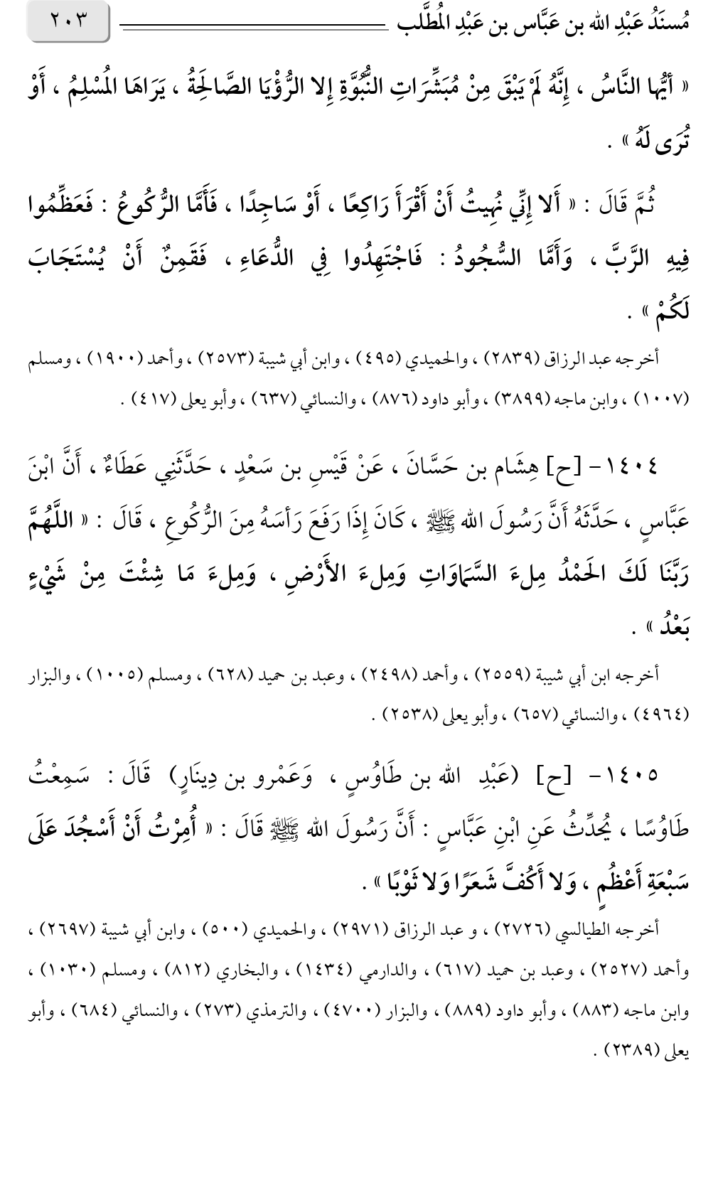 ١٤٠٥ - [ح] (عَبْدِ الله بن طَاوُسٍ، وَعَمْرو بن دِينَارٍ) قَالَ: سَمِعْتُ طَاوُسًا، يُحدِّثُ عَنِ ابْنِ عَبَّاسٍ: أَنَّ رَسُولَ الله صلى الله عليه وسلم قَالَ: «أُمِرْتُ أَنْ أَسْجُدَ عَلَى سَبْعَةِ أَعْظُمٍ، وَلا أَكُفَّ شَعَرًا وَلا ثَوْبًا».