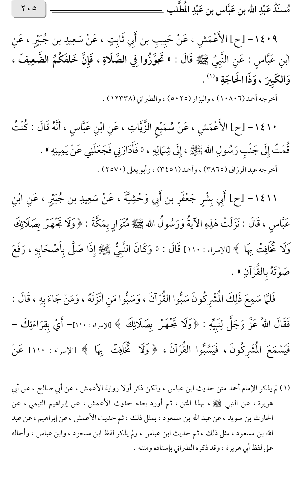 (¬١) لم يذكر الإمام أحمد متن حديث ابن عباس، ولكن ذكر أولا رواية الأعمش، عن أبي صالح، عن أبي هريرة، عن النبي صلى الله عليه وسلم، بهذا المتن، ثم أورد بعده حديث الأعمش، عن إبراهيم التيمي، عن الحارث بن سويد، عن عبد الله بن مسعود، بمثل ذلك، ثم حديث الأعمش، عن إبراهيم، عن عبد الله بن مسعود، مثل ذلك، ثم حديث ابن عباس، ولم يذكر لفظ ابن مسعود، وابن عباس، وأحاله على لفظ أبي هريرة، وقد ذكره الطبراني بإسناده ومتنه.