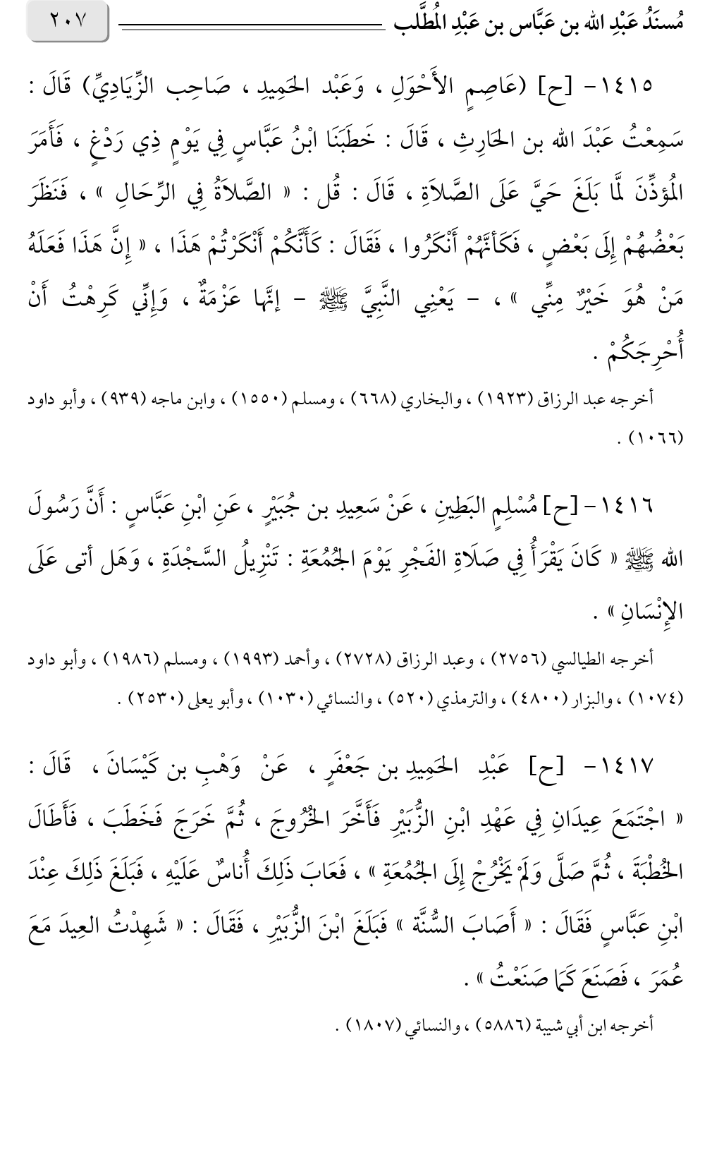 ١٤١٥ - [ح] (عَاصِمٍ الأَحْوَلِ، وَعَبْد الحَمِيدِ، صَاحِب الزِّيَادِيِّ) قَالَ: سَمِعْتُ عَبْدَ الله بن الحَارِثِ، قَالَ: خَطَبَنَا ابْنُ عَبَّاسٍ فِي يَوْمٍ ذِي رَدْغٍ، فَأَمَرَ المُؤذِّنَ لمَّا بَلَغَ حَيَّ عَلَى الصَّلاةِ، قَالَ: قُل: «الصَّلاةُ فِي الرِّحَالِ» فَنَظَرَ، ، بَعْضُهُمْ إِلَى بَعْضٍ، فَكَأنَّهُمْ أَنْكَرُوا، فَقَالَ: كَأَنَّكُمْ أَنْكَرْتُمْ هَذَا «إِنَّ هَذَا فَعَلَهُ مَنْ هُوَ خَيْرٌ مِنِّي»، - يَعْنِي النَّبِيَّ صلى الله عليه وسلم - إنَّها عَزْمَةٌ، وَإِنِّي كَرِهْتُ أَنْ -، أُحْرِجَكُمْ.