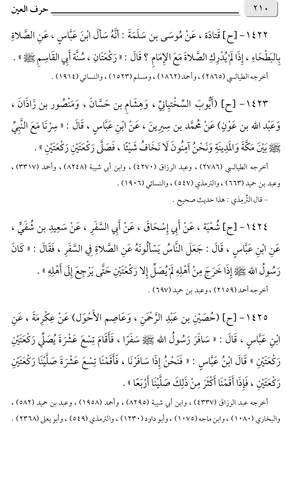 ١٤٢٥ - [ح] (حُصَيْنِ بن عَبْدِ الرَّحْمَنِ، وَعَاصِم الأَحْوَل) عَنْ عِكْرِمَةَ، عَنِ ابْنِ عَبَّاسٍ، قَالَ: «سَافَرَ رَسُولُ الله صلى الله عليه وسلم سَفَرًا، فَأَقَامَ تِسْعَ عَشْرَةَ يُصَلِّي رَكْعَتَيْنِ رَكْعَتَيْنِ» قَالَ ابْنُ عَبَّاسٍ: «فَنَحْنُ إِذَا سَافَرْنَا، فَأَقَمْنَا تِسْعَ عَشْرَةَ صَلَّيْنَا رَكْعَتَيْنِ رَكْعَتَيْنِ، فَإِذَا أَقَمْنَا أَكْثَرَ مِنْ ذَلِكَ صَلَّيْنَا أَرْبَعًا».
