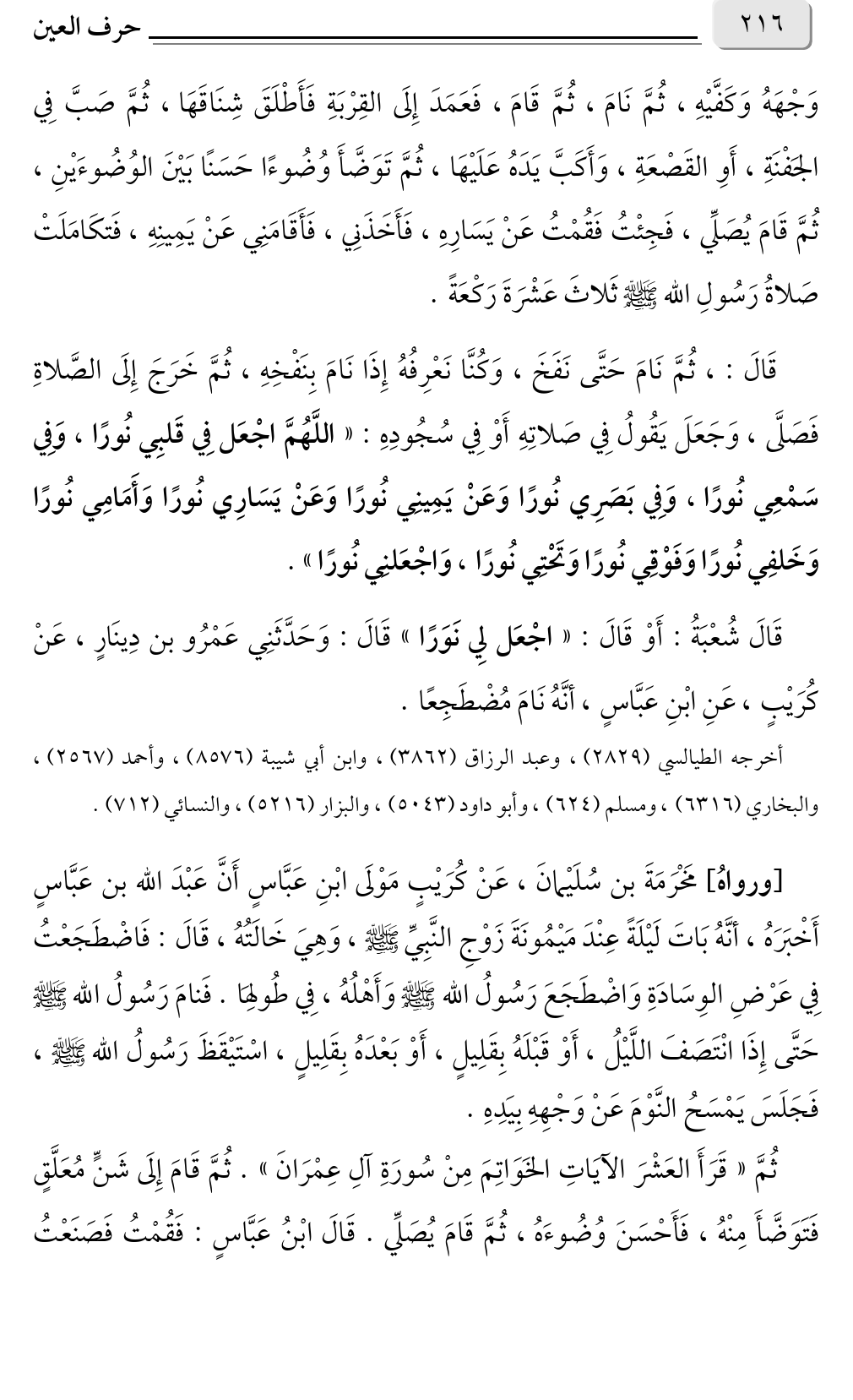 قَالَ: ، ثُمَّ نَامَ حَتَّى نَفَخَ، وَكُنَّا نَعْرِفُهُ إِذَا نَامَ بِنَفْخِهِ، ثُمَّ خَرَجَ إِلَى الصَّلاةِ فَصَلَّى، وَجَعَلَ يَقُولُ فِي صَلاتِهِ أَوْ فِي سُجُودِهِ: «اللَّهُمَّ اجْعَل فِي قَلبِي نُورًا، وَفِي سَمْعِي نُورًا، وَفِي بَصَرِي نُورًا وَعَنْ يَمِينِي نُورًا وَعَنْ يَسَارِي نُورًا وَأَمَامِي نُورًا وَخَلفِي نُورًا وَفَوْقِي نُورًا وَتَحْتِي نُورًا، وَاجْعَلنِي نُورًا».