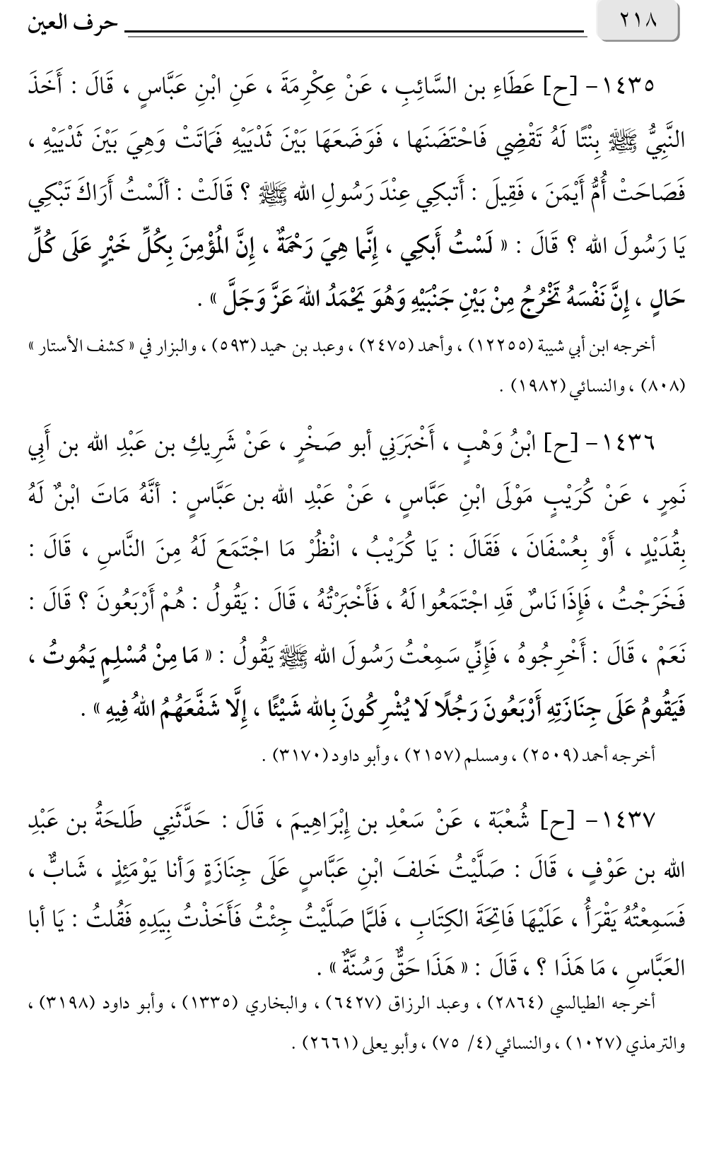 ١٤٣٦ - [ح] ابْنُ وَهْبٍ، أَخْبَرَنِي أبو صَخْرٍ، عَنْ شَرِيكِ بن عَبْدِ الله بن أَبِي نَمِرٍ، عَنْ كُرَيْبٍ مَوْلَى ابْنِ عَبَّاسٍ، عَنْ عَبْدِ الله بن عَبَّاسٍ: أنَّهُ مَاتَ ابْنٌ لَهُ بِقُدَيْدٍ، أَوْ بِعُسْفَانَ، فَقَالَ: يَا كُرَيْبُ، انْظُرْ مَا اجْتَمَعَ لَهُ مِنَ النَّاسِ، قَالَ: فَخَرَجْتُ، فَإِذَا نَاسٌ قَدِ اجْتَمَعُوا لَهُ، فَأَخْبَرْتُهُ، قَالَ: يَقُولُ: هُمْ أَرْبَعُونَ؟ قَالَ: نَعَمْ، قَالَ: أَخْرِجُوهُ، فَإِنِّي سَمِعْتُ رَسُولَ الله صلى الله عليه وسلم يَقُولُ: «مَا مِنْ مُسْلِمٍ يَمُوتُ، فَيَقُومُ عَلَى جِنَازَتِهِ أَرْبَعُونَ رَجُلًا لَا يُشْرِكُونَ بِالله شَيْئًا، إِلَّا شَفَّعَهُمُ اللهُ فِيهِ».
