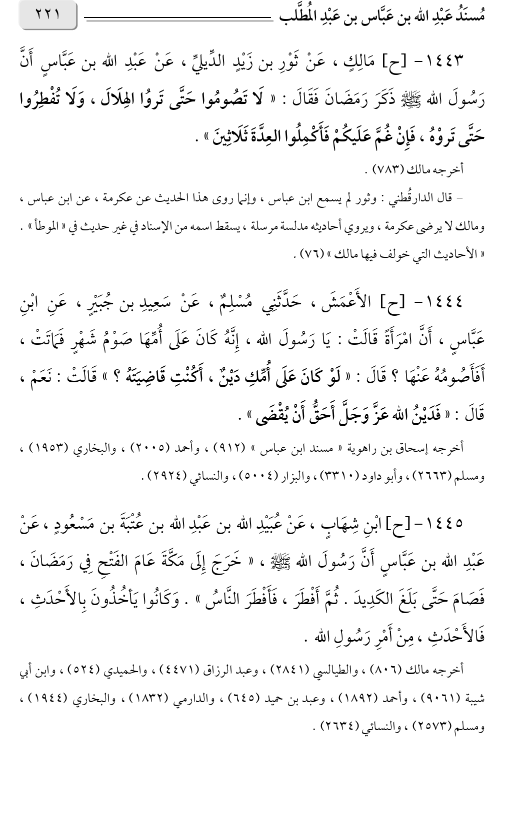١٤٤٣ - [ح] مَالِكٍ، عَنْ ثَوْرِ بن زَيْدٍ الدِّيليِّ، عَنْ عَبْدِ الله بن عَبَّاسٍ أَنَّ رَسُولَ الله صلى الله عليه وسلم ذَكَرَ رَمَضَانَ فَقَالَ: «لَا تَصُومُوا حَتَّى تَروُا الهِلَالَ، وَلَا تُفْطِرُوا حَتَّى تَروْهُ، فَإِنْ غُمَّ عَلَيكُمْ فَأَكْمِلُوا العِدَّةَ ثَلَاثِينَ».