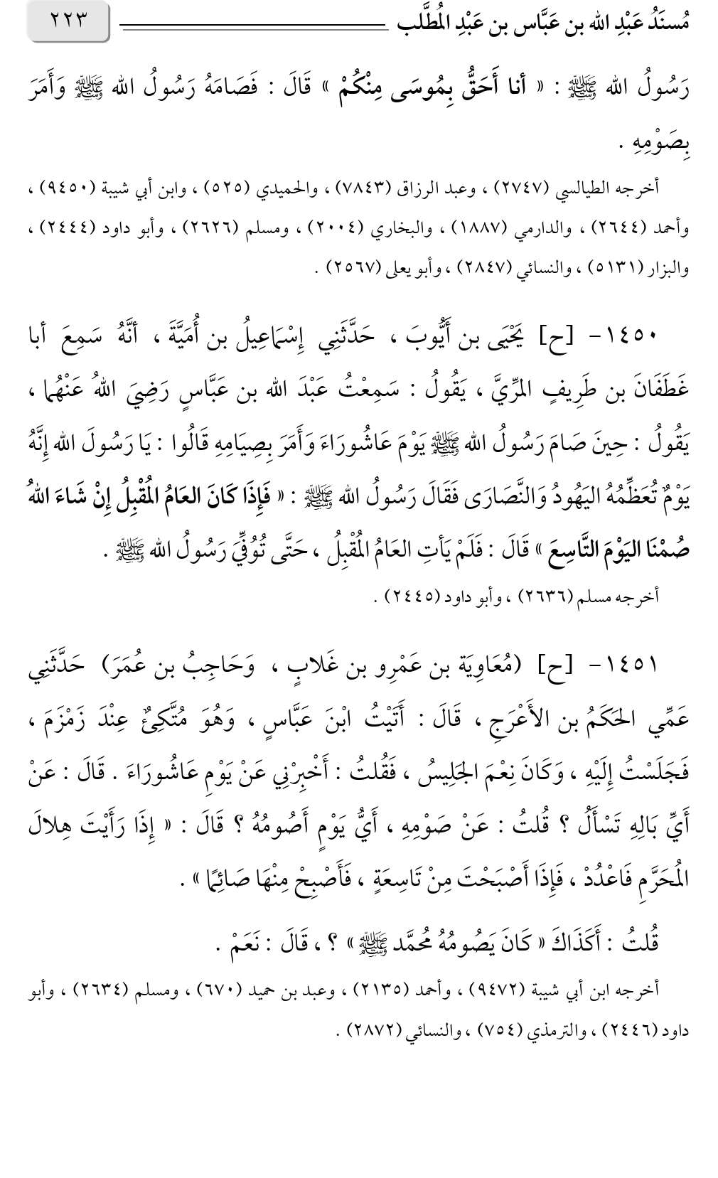 ١٤٥٠ - [ح] يَحْيَى بن أَيُّوبَ، حَدَّثَنِي إِسْمَاعِيلُ بن أُمَيَّةَ، أنَّهُ سَمِعَ أبا غَطَفَانَ بن طَرِيفٍ المرِّيَّ، يَقُولُ: سَمِعْتُ عَبْدَ الله بن عَبَّاسٍ رَضِيَ اللهُ عَنْهُما، يَقُولُ: حِينَ صَامَ رَسُولُ الله صلى الله عليه وسلم يَوْمَ عَاشُورَاءَ وَأَمَرَ بِصِيَامِهِ قَالُوا: يَا رَسُولَ الله إِنَّهُ يَوْمٌ تُعَظِّمُهُ اليَهُودُ وَالنَّصَارَى فَقَالَ رَسُولُ الله صلى الله عليه وسلم: «فَإِذَا كَانَ العَامُ المُقْبِلُ إِنْ شَاءَ اللهُ صُمْنَا اليَوْمَ التَّاسِعَ» قَالَ: فَلَمْ يَأتِ العَامُ المُقْبِلُ، حَتَّى تُوُفِّيَ رَسُولُ الله صلى الله عليه وسلم.
