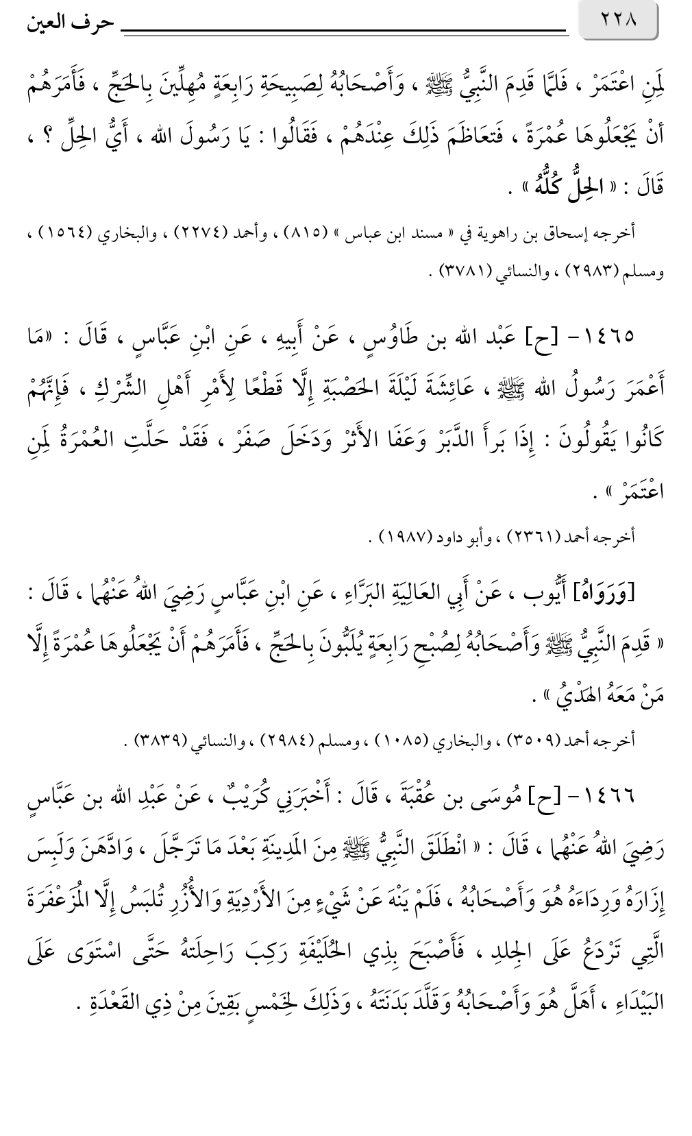 ١٤٦٥ - [ح] عَبْد الله بن طَاوُسٍ، عَنْ أَبِيهِ، عَنِ ابْنِ عَبَّاسٍ، قَالَ: «مَا أَعْمَرَ رَسُولُ الله صلى الله عليه وسلم، عَائِشَةَ لَيْلَةَ الحَصْبَةِ إِلَّا قَطْعًا لِأَمْرِ أَهْلِ الشِّرْكِ، فَإِنَّهُمْ كَانُوا يَقُولُونَ: إِذَا بَرأَ الدَّبَرْ وَعَفَا الأَثرْ وَدَخَلَ صَفَرْ، فَقَدْ حَلَّتِ العُمْرَةُ لمَنِ اعْتَمَرْ».