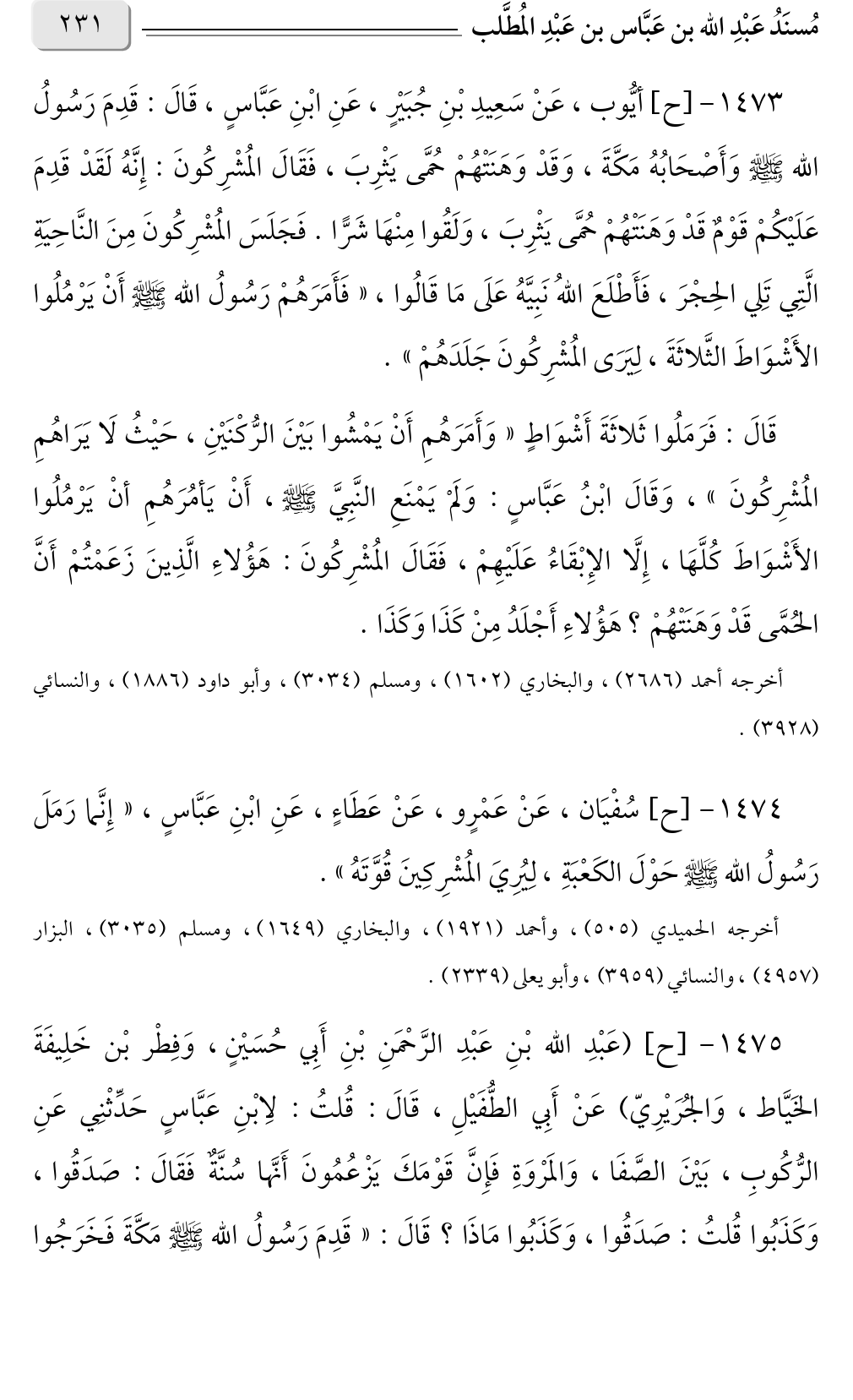 ١٤٧٥ - [ح] (عَبْدِ الله بْنِ عَبْدِ الرَّحْمَنِ بْنِ أَبِي حُسَيْنٍ، وَفِطْر بْن خَلِيفَةَ الخَيَّاط، وَالجُرَيْرِيّ) عَنْ أَبِي الطُّفَيْلِ، قَالَ: قُلتُ: لِابْنِ عَبَّاسٍ حَدِّثْنِي عَنِ الرُّكُوبِ، بَيْنَ الصَّفَا، وَالمَرْوَةِ فَإِنَّ قَوْمَكَ يَزْعُمُونَ أَنَّها سُنَّةٌ فَقَالَ: صَدَقُوا، وَكَذَبُوا قُلتُ: صَدَقُوا، وَكَذَبُوا مَاذَا؟ قَالَ: «قَدِمَ رَسُولُ الله صلى الله عليه وسلم مَكَّةَ فَخَرَجُوا