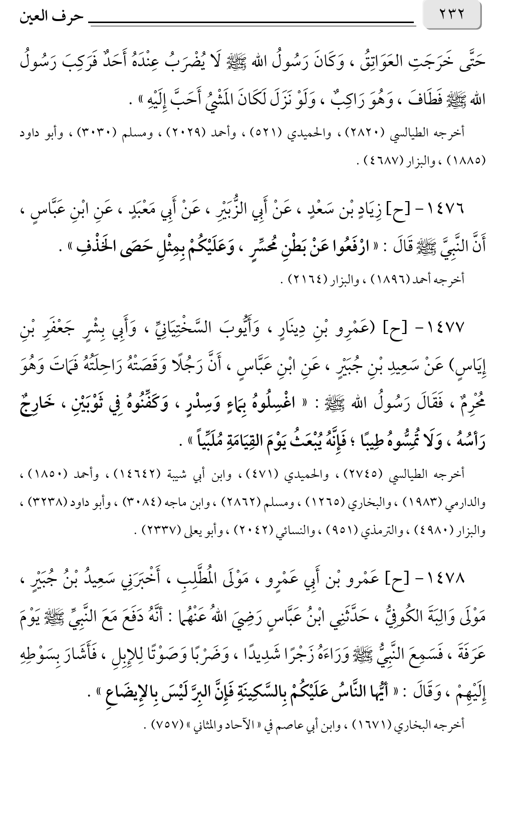 ١٤٧٦ - [ح] زِيَادٍ بْن سَعْدٍ، عَنْ أَبِي الزُّبَيْرِ، عَنْ أَبِي مَعْبَدٍ، عَنِ ابْنِ عَبَّاسٍ، أَنَّ النَّبِيَّ صلى الله عليه وسلم قَالَ: «ارْفَعُوا عَنْ بَطْنِ مُحسِّرٍ، وَعَلَيْكُمْ بِمِثْلِ حَصَى الخَذْفِ».