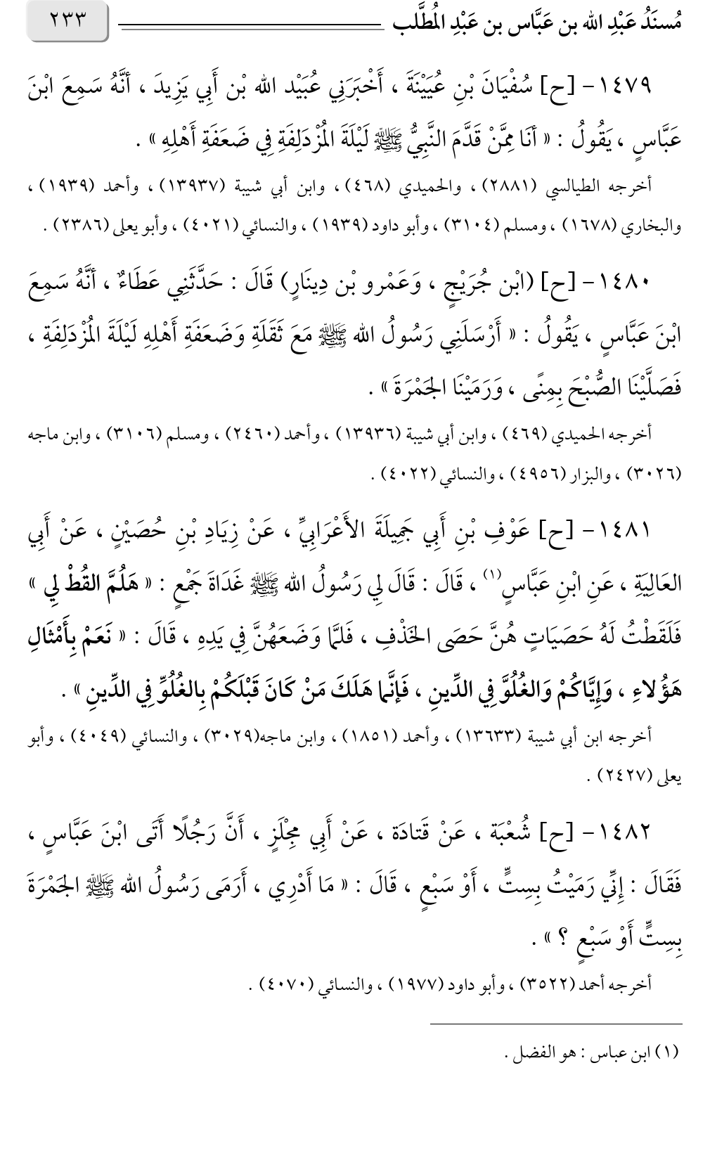 ١٤٨١ - [ح] عَوْفِ بْنِ أَبِي جَمِيلَةَ الأَعْرَابِيِّ، عَنْ زِيَادِ بْنِ حُصَيْنٍ، عَنْ أَبِي العَالِيَةِ، عَنِ ابْنِ عَبَّاسٍ (¬١)، قَالَ: قَالَ لِي رَسُولُ الله صلى الله عليه وسلم غَدَاةَ جَمْعٍ: «هَلُمَّ القُطْ لِي» فَلَقَطْتُ لَهُ حَصَيَاتٍ هُنَّ حَصَى الخَذْفِ، فَلمَّا وَضَعَهُنَّ فِي يَدِهِ، قَالَ: «نَعَمْ بِأَمْثَالِ هَؤُلاءِ، وَإِيَّاكُمْ وَالغُلُوَّ فِي الدِّينِ، فَإنَّما هَلَكَ مَنْ كَانَ قَبْلَكُمْ بِالغُلُوِّ فِي الدِّينِ».