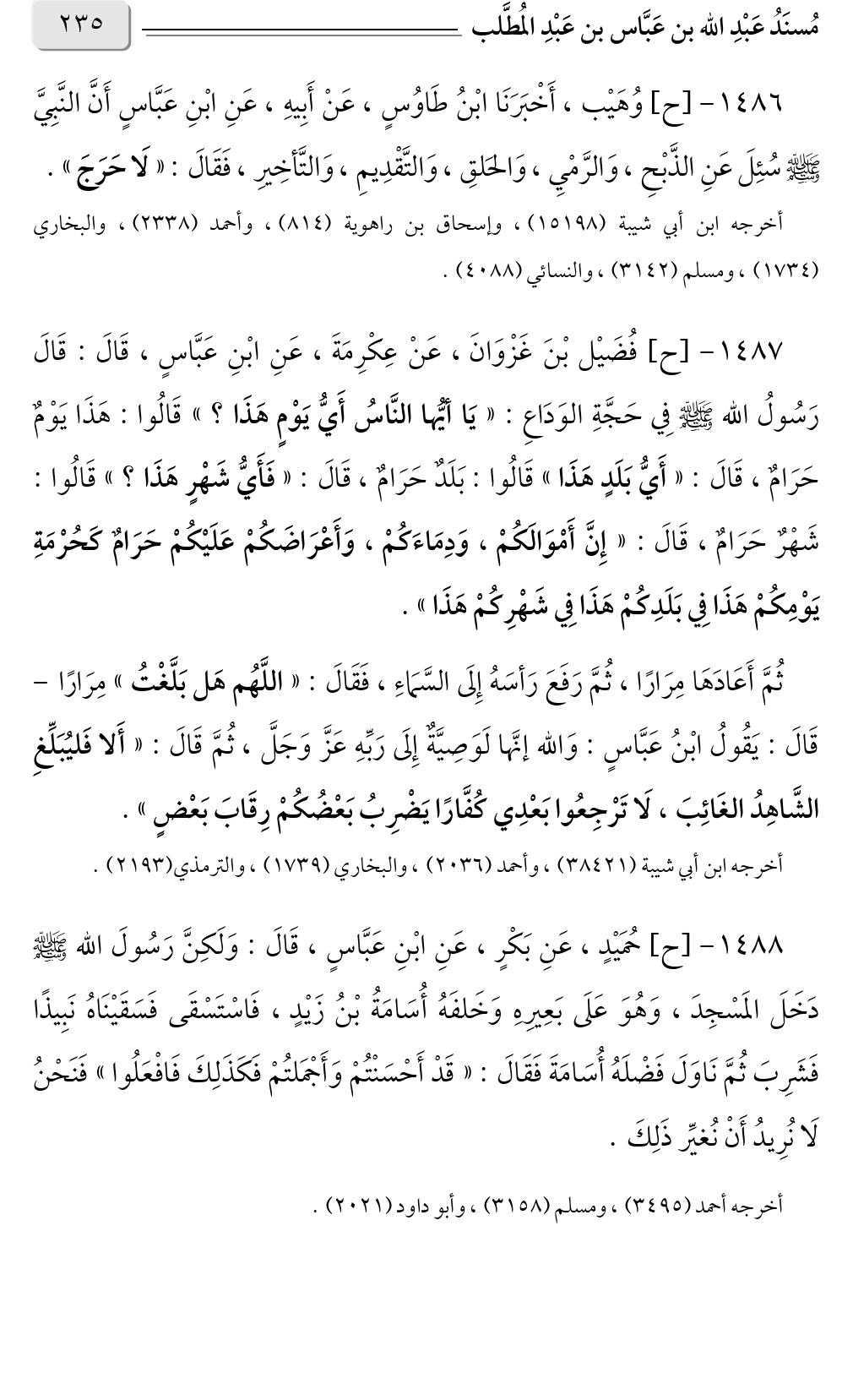 ١٤٨٧ - [ح] فُضَيْل بْنَ غَزْوَانَ، عَنْ عِكْرِمَةَ، عَنِ ابْنِ عَبَّاسٍ، قَالَ: قَالَ رَسُولُ الله صلى الله عليه وسلم فِي حَجَّةِ الوَدَاعِ: «يَا أيُّها النَّاسُ أَيُّ يَوْمٍ هَذَا؟ » قَالُوا: هَذَا يَوْمٌ حَرَامٌ، قَالَ: «أَيُّ بَلَدٍ هَذَا؟ » قَالُوا: بَلَدٌ حَرَامٌ، قَالَ: «فَأَيُّ شَهْرٍ هَذَا؟ » قَالُوا: شَهْرٌ حَرَامٌ، قَالَ: «إِنَّ أَمْوَالَكُمْ، وَدِمَاءَكُمْ، وَأَعْرَاضَكُمْ عَلَيْكُمْ حَرَامٌ كَحُرْمَةِ يَوْمِكُمْ هَذَا فِي بَلَدِكُمْ هَذَا فِي شَهْرِكُمْ هَذَا».