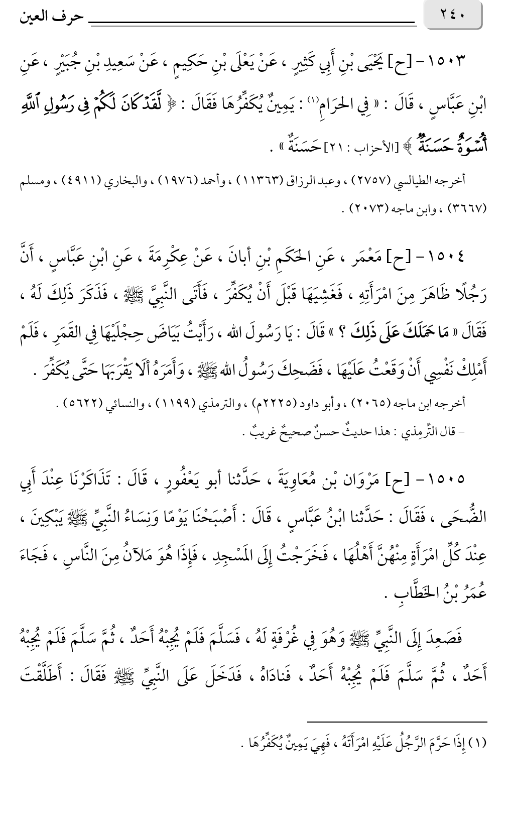١٥٠٣ - [ح] يَحْيَى بْنِ أَبِي كَثِيرٍ، عَنْ يَعْلَى بْنِ حَكِيمٍ، عَنْ سَعِيدِ بْنِ جُبَيْرٍ، عَنِ ابْنِ عَبَّاسٍ، قَالَ: «فِي الحرَامِ (¬١): يَمِينٌ يُكَفِّرُهَا فَقَالَ: {لَقَدْ كَانَ لَكُمْ فِي رَسُولِ اللَّهِ أُسْوَةٌ حَسَنَةٌ} [الأحزاب: ٢١] حَسَنَةٌ».