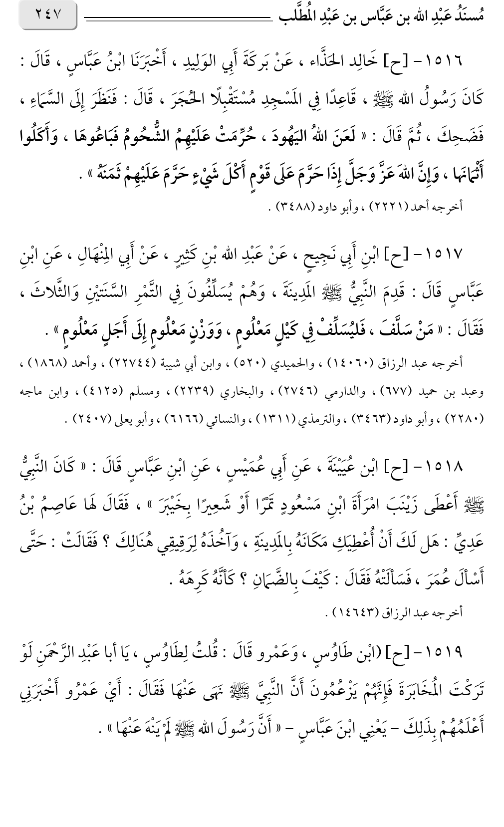 ١٥١٦ - [ح] خَالِد الحَذَّاء، عَنْ بَركَةَ أَبِي الوَلِيدِ، أَخْبَرَنَا ابْنُ عَبَّاسٍ، قَالَ: كَانَ رَسُولُ الله صلى الله عليه وسلم، قَاعِدًا فِي المَسْجِدِ مُسْتَقْبِلًا الحُجَرَ، قَالَ: فَنَظَرَ إِلَى السَّمَاءِ، فَضَحِكَ، ثُمَّ قَالَ: «لَعَنَ اللهُ اليَهُودَ، حُرِّمَتْ عَلَيْهِمُ الشُّحُومُ فَبَاعُوهَا، وَأَكَلُوا أَثْمَانَها، وَإِنَّ اللهَ عَزَّ وَجَلَّ إِذَا حَرَّمَ عَلَى قَوْمٍ أَكْلَ شَيْءٍ حَرَّمَ عَلَيْهِمْ ثَمَنَهُ».