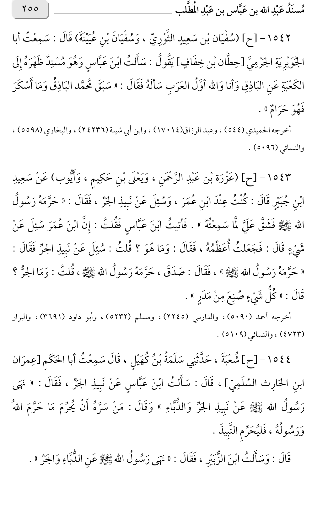 ١٥٤٢ - [ح] (سُفْيَان بْن سَعِيدٍ الثَّوْرِيّ، وَسُفْيَانَ بْنِ عُيَيْنَةَ) قَالَ: سَمِعْتُ أبا الجُوَيْرِيَةِ الجَرْمِيَّ [حِطَّان بْن خِفَافٍ] يَقُولُ: سَأَلتُ ابْنَ عَبَّاسٍ وَهُوَ مُسْنِدٌ ظَهْرَهُ إِلَى الكَعْبَةِ عَنِ البَاذِقِ وَأنا وَالله أوَّلُ العَرَبِ سَألَهُ فَقَالَ: «سَبَقَ مُحمَّد البَاذِقُ وَمَا أَسْكَرَ فَهُوَ حَرَامٌ».