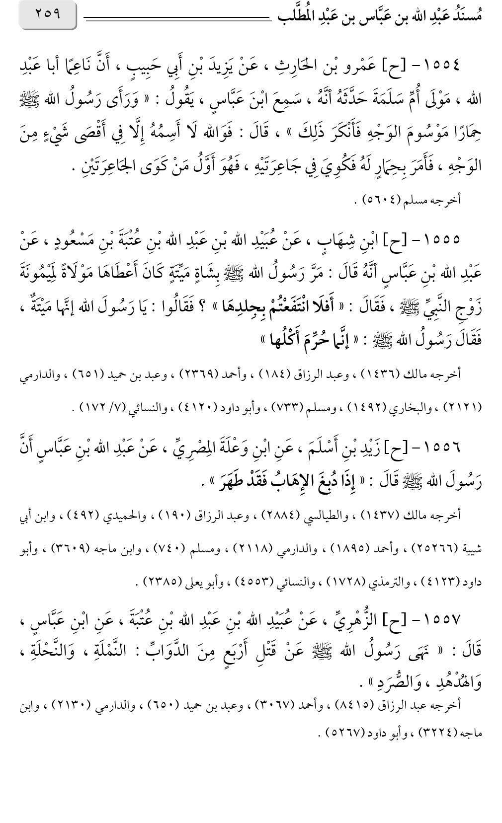 ١٥٥٥ - [ح] ابْنِ شِهَابٍ، عَنْ عُبَيْدِ الله بْنِ عَبْدِ الله بْنِ عُتْبَةَ بْنِ مَسْعُودٍ، عَنْ عَبْدِ الله بْنِ عَبَّاسٍ أنَّهُ قَالَ: مَرَّ رَسُولُ الله صلى الله عليه وسلم بِشَاةٍ مَيِّتَةٍ كَانَ أَعْطَاهَا مَوْلَاةً لمَيْمُونَةَ زَوْجِ النَّبِيِّ صلى الله عليه وسلم، فَقَالَ: «أَفلَا انْتَفَعْتُمْ بِجِلدِهَا؟ » فَقَالُوا: يَا رَسُولَ الله إنَّها مَيْتَةٌ، فَقَالَ رَسُولُ الله صلى الله عليه وسلم: «إنَّما حُرِّمَ أَكْلُها»
