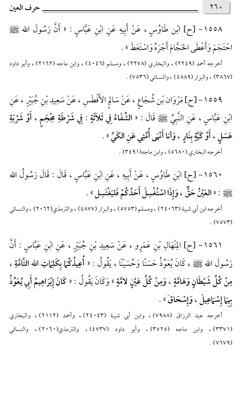 ١٥٦٠ - [ح] ابْنِ طَاوُسٍ، عَنْ أَبِيهِ، عَنِ ابْنِ عَبَّاسٍ، قَالَ: قَالَ رَسُولُ الله صلى الله عليه وسلم: «العَيْنُ حَقٌّ، وَإِذَا اسْتُغْسِلَ أَحَدُكُمْ فَليَغْتَسِل».