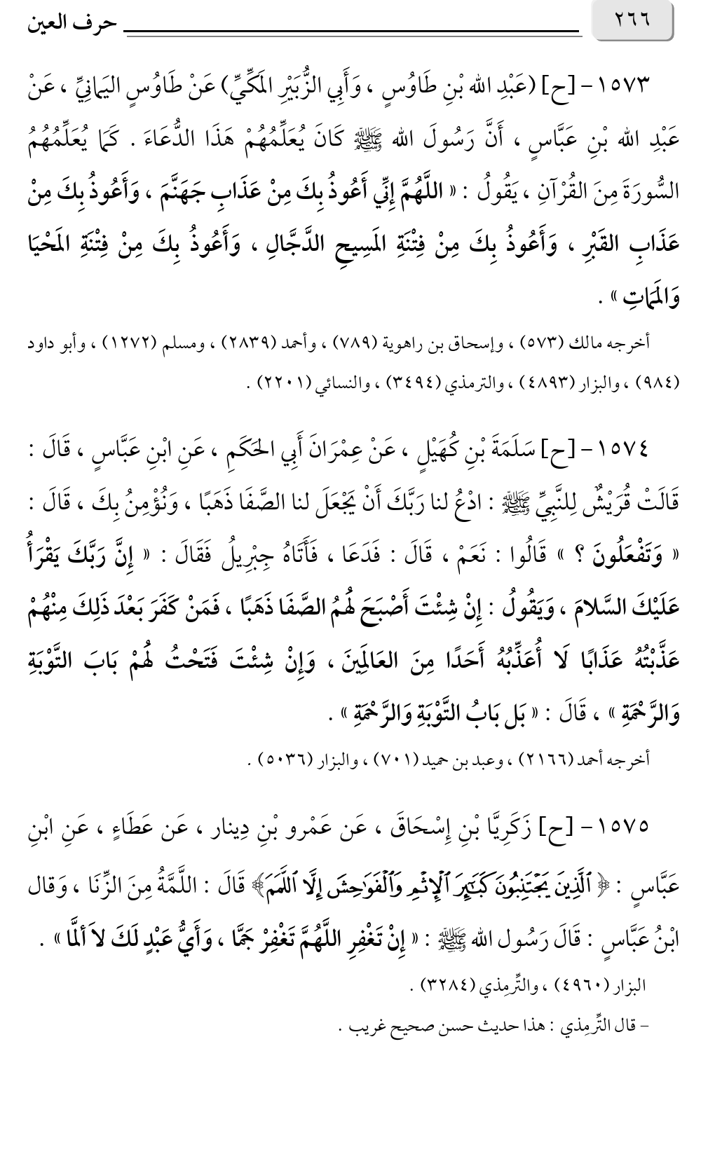 ١٥٧٣ - [ح] (عَبْدِ الله بْنِ طَاوُسٍ، وَأَبِي الزُّبَيْرِ المَكِّيِّ) عَنْ طَاوُسٍ اليَمانِيِّ، عَنْ عَبْدِ الله بْنِ عَبَّاسٍ، أَنَّ رَسُولَ الله صلى الله عليه وسلم كَانَ يُعَلِّمُهُمْ هَذَا الدُّعَاءَ. كَمَا يُعَلِّمُهُمُ السُّورَةَ مِنَ القُرْآنِ، يَقُولُ: «اللَّهُمَّ إِنِّي أَعُوذُ بِكَ مِنْ عَذَابِ جَهَنَّمَ، وَأَعُوذُ بِكَ مِنْ عَذَابِ القَبْرِ، وَأَعُوذُ بِكَ مِنْ فِتْنَةِ المَسِيحِ الدَّجَّالِ، وَأَعُوذُ بِكَ مِنْ فِتْنَةِ المَحْيَا وَالمَمَاتِ».