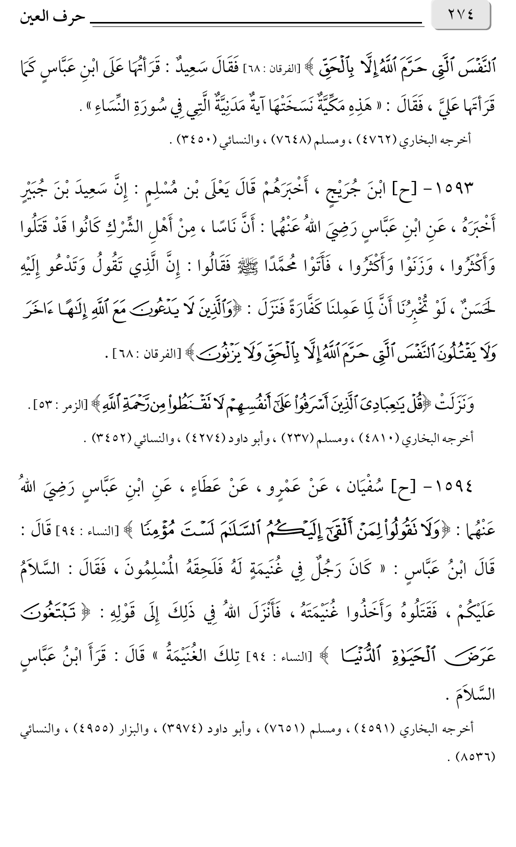 ١٥٩٤ - [ح] سُفْيَان، عَنْ عَمْرٍو، عَنْ عَطَاءٍ، عَنِ ابْنِ عَبَّاسٍ رَضِيَ اللهُ عَنْهُما: {وَلَا تَقُولُوا لِمَنْ أَلْقَى إِلَيْكُمُ السَّلَامَ لَسْتَ مُؤْمِنًا} [النساء: ٩٤] قَالَ: قَالَ ابْنُ عَبَّاسٍ: «كَانَ رَجُلٌ فِي غُنَيمَةٍ لَهُ فَلَحِقَهُ المُسْلِمُونَ، فَقَالَ: السَّلامُ عَلَيْكُمْ، فَقَتَلُوهُ وَأَخَذُوا غُنَيْمَتَهُ، فَأَنْزَلَ اللهُ فِي ذَلِكَ إِلَى قَوْلِهِ: {تَبْتَغُونَ عَرَضَ الْحَيَاةِ الدُّنْيَا} [النساء: ٩٤] تِلكَ الغُنَيْمَةُ» قَالَ: قَرَأَ ابْنُ عَبَّاسٍ السَّلامَ.