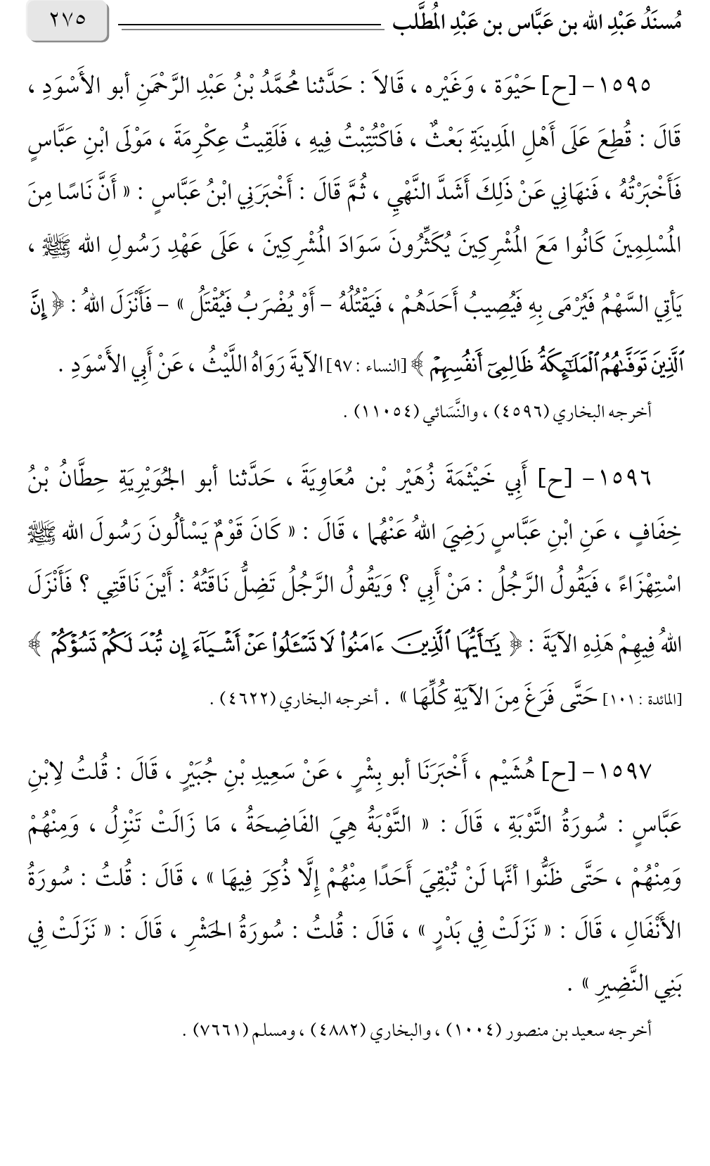 ١٥٩٥ - [ح] حَيْوَة، وَغَيْره، قَالا: حَدَّثنا مُحمَّدُ بْنُ عَبْدِ الرَّحْمَنِ أبو الأَسْوَدِ، قَالَ: قُطِعَ عَلَى أَهْلِ المَدِينَةِ بَعْثٌ، فَاكْتُتِبْتُ فِيهِ، فَلَقِيتُ عِكْرِمَةَ، مَوْلَى ابْنِ عَبَّاسٍ فَأَخْبَرْتُهُ، فَنهَانِي عَنْ ذَلِكَ أَشَدَّ النَّهْيِ، ثُمَّ قَالَ: أَخْبَرَنِي ابْنُ عَبَّاسٍ: «أَنَّ نَاسًا مِنَ المُسْلِمِينَ كَانُوا مَعَ المُشْرِكِينَ يُكَثِّرُونَ سَوَادَ المُشْرِكِينَ، عَلَى عَهْدِ رَسُولِ الله صلى الله عليه وسلم، يَأتِي السَّهْمُ فَيُرْمَى بِهِ فَيُصِيبُ أَحَدَهُمْ، فَيَقْتُلُهُ - أَوْ يُضْرَبُ فَيُقْتَلُ» - فَأَنْزَلَ اللهُ: {إِنَّ الَّذِينَ تَوَفَّاهُمُ الْمَلَائِكَةُ ظَالِمِي أَنْفُسِهِمْ} [النساء: ٩٧] الآيةَ رَوَاهُ اللَّيْثُ، عَنْ أَبِي الأَسْوَدِ.