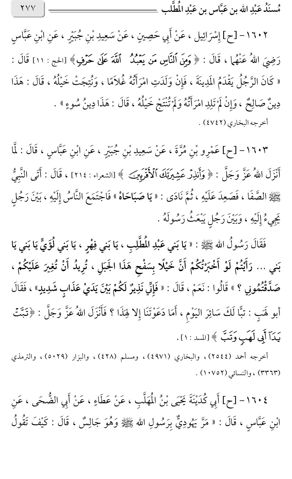 فَقَالَ رَسُولُ الله صلى الله عليه وسلم: «يَا بَني عَبْدِ المُطَّلِبِ، يَا بَني فِهْرٍ، يَا بَني لُؤَيٍّ يَا بَني يَا بَني ... رَأَيْتُمْ لَوْ أَخْبَرْتُكُمْ أَنَّ خَيْلًا بِسَفْحِ هَذَا الجَبَلِ، تُرِيدُ أَنْ تُغِيرَ عَلَيْكُمْ، صَدَّقْتُمُونِي؟ » قَالُوا: نَعَمْ، قَالَ: «فَإِنِّي نَذِيرٌ لَكُمْ بَيْنَ يَدَيْ عَذَابٍ شَدِيدٍ» فَقَالَ، أبو لَهَبٍ: تبًّا لَكَ سَائِرَ اليَوْمِ، أَمَا دَعَوْتَنَا إِلا لهَذَا؟ فَأَنْزَلَ اللهُ عَزَّ وَجَلَّ: {تَبَّتْ يَدَا أَبِي لَهَبٍ وَتَبَّ} [المسد: ١].