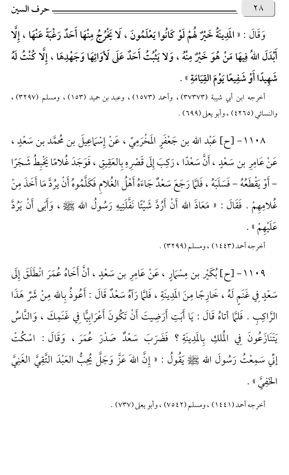 ١١٠٩ - [ح] بُكَيْر بن مِسْمَارٍ، عَنْ عَامِرِ بن سَعْدٍ، أنَّ أَخَاهُ عُمَرَ انْطَلَقَ إِلَى سَعْدٍ فِي غَنَمٍ لَهُ، خَارِجًا مِنَ المَدِينَةِ، فَلمَّا رَآهُ سَعْدٌ قَالَ: أَعُوذُ بِالله مِنْ شَرِّ هَذَا يا فِي غَنَمِكَ، وَالنَّاسُ .. الرَّاكِبِ. فَلمَّا أتاهُ قَالَ: يَا أَبَتِ أَرَضِيتَ أَنْ تَكُونَ أَعْرَابِ يَتَنَازَعُونَ فِي المُلكِ بِالمَدِينَةِ؟ فَضَرَبَ سَعْدٌ صَدْرَ عُمَرَ، وَقَالَ: اسْكُتْ إنِّي سَمِعْتُ رَسُولَ الله صلى الله عليه وسلم يَقُولُ: «إِنَّ اللهَ عَزَّ وَجَلَّ يُحِبُّ العَبْدَ التَّقِيَّ الغَنِيَّ الخَفِيَّ».