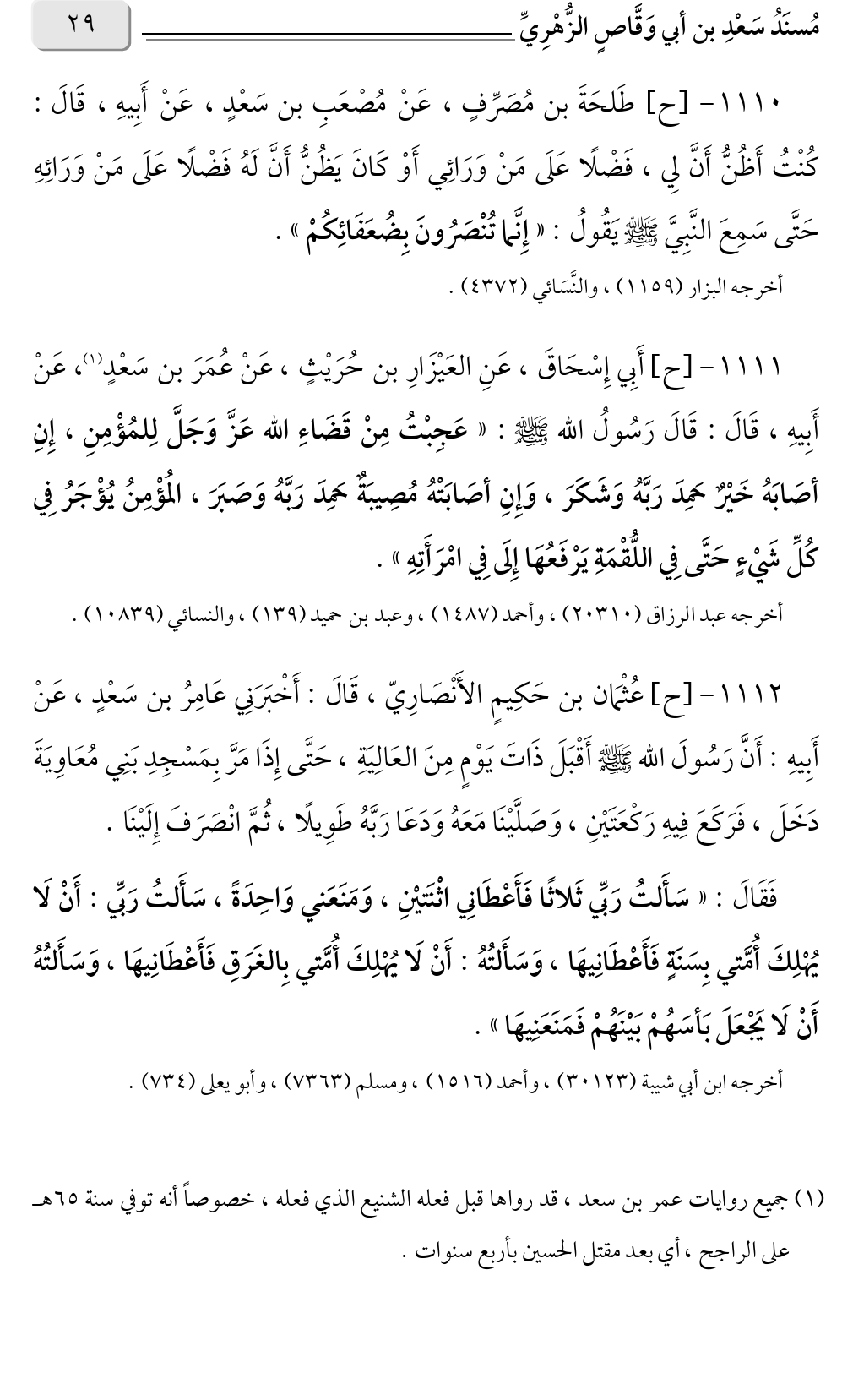 ١١١٠ - [ح] طَلحَةَ بن مُصَرِّفٍ، عَنْ مُصْعَبِ بن سَعْدٍ، عَنْ أَبِيهِ، قَالَ: كُنْتُ أَظُنُّ أَنَّ لِي، فَضْلًا عَلَى مَنْ وَرَائِي أَوْ كَانَ يَظُنُّ أَنَّ لَهُ فَضْلًا عَلَى مَنْ وَرَائِهِ حَتَّى سَمِعَ النَّبِيَّ صلى الله عليه وسلم يَقُولُ: «إِنَّما تُنْصَرُونَ بِضُعَفَائِكُمْ».
