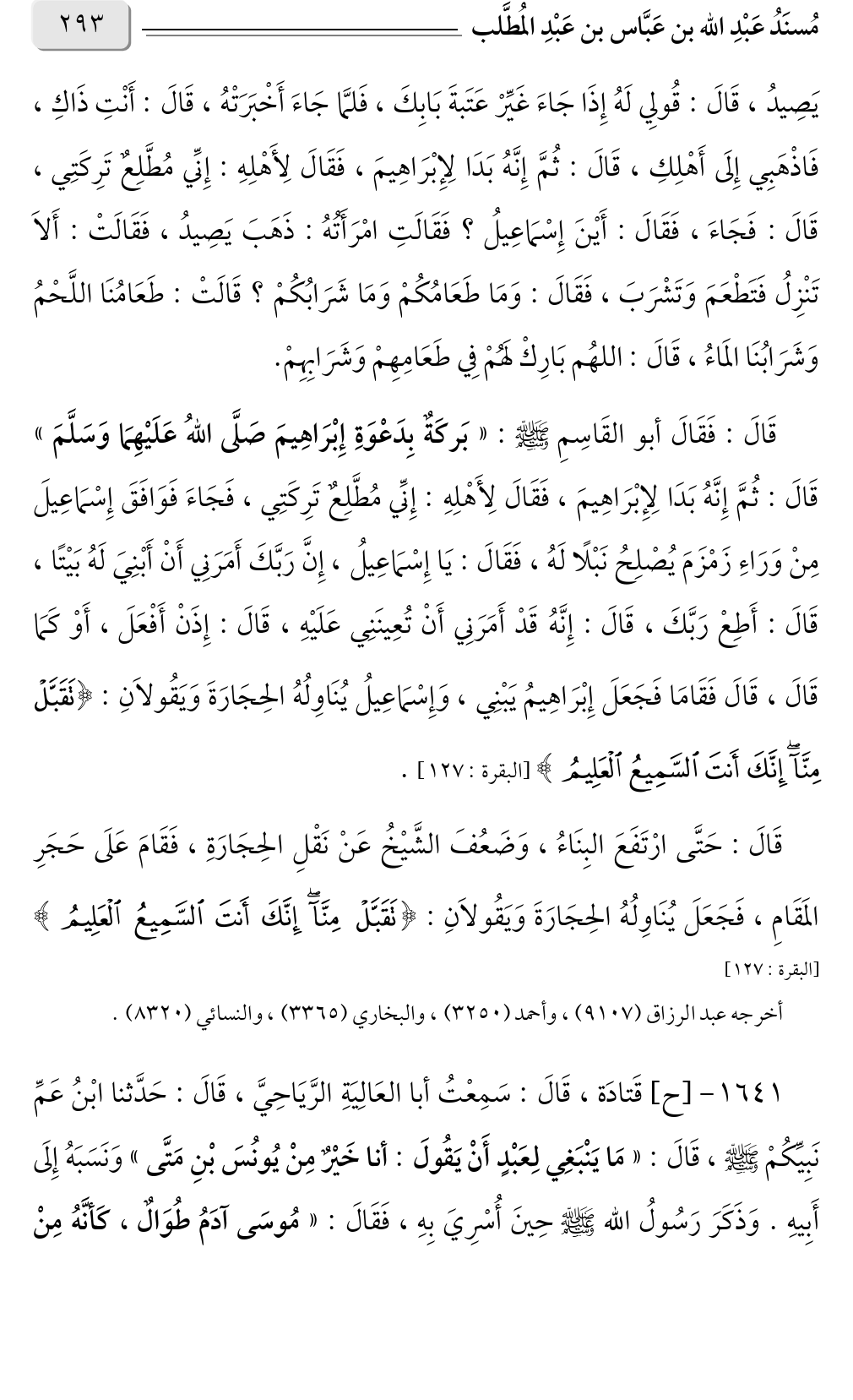 قَالَ: فَقَالَ أبو القَاسِمِ صلى الله عليه وسلم: «بَركَةٌ بِدَعْوَةِ إِبْرَاهِيمَ صَلَّى اللهُ عَلَيْهِمَا وَسَلَّمَ» قَالَ: ثُمَّ إِنَّهُ بَدَا لِإِبْرَاهِيمَ، فَقَالَ لِأَهْلِهِ: إِنِّي مُطَّلِعٌ تَرِكَتِي، فَجَاءَ فَوَافَقَ إِسْمَاعِيلَ مِنْ وَرَاءِ زَمْزَمَ يُصْلِحُ نَبْلًا لَهُ، فَقَالَ: يَا إِسْمَاعِيلُ، إِنَّ رَبَّكَ أَمَرَنِي أَنْ أَبْنِيَ لَهُ بَيْتًا، قَالَ: أَطِعْ رَبَّكَ، قَالَ: إِنَّهُ قَدْ أَمَرَنِي أَنْ تُعِينَنِي عَلَيْهِ، قَالَ: إِذَنْ أَفْعَلَ، أَوْ كَمَا قَالَ، قَالَ فَقَامَا فَجَعَلَ إِبْرَاهِيمُ يَبْنِي، وَإِسْمَاعِيلُ يُنَاوِلُهُ الحِجَارَةَ وَيَقُولانِ: {تَقَبَّلْ مِنَّا إِنَّكَ أَنْتَ السَّمِيعُ الْعَلِيمُ} [البقرة: ١٢٧].