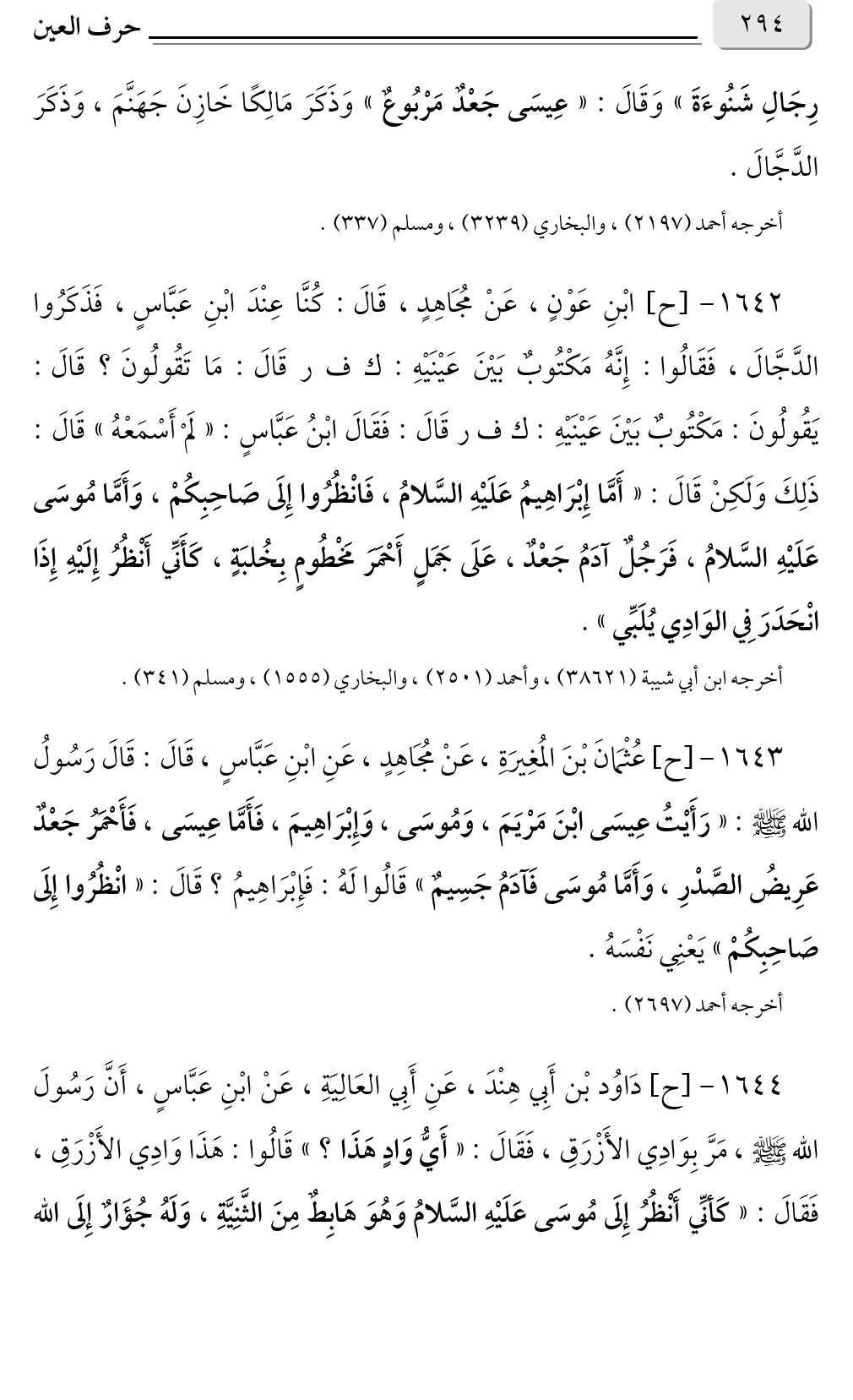 ١٦٤٢ - [ح] ابْنِ عَوْنٍ، عَنْ مُجَاهِدٍ، قَالَ: كُنَّا عِنْدَ ابْنِ عَبَّاسٍ، فَذَكَرُوا الدَّجَّالَ، فَقَالُوا: إِنَّهُ مَكْتُوبٌ بَيْنَ عَيْنَيْهِ: ك ف ر قَالَ: مَا تَقُولُونَ؟ قَالَ: يَقُولُونَ: مَكْتُوبٌ بَيْنَ عَيْنَيْهِ: ك ف ر قَالَ: فَقَالَ ابْنُ عَبَّاسٍ: «لَمْ أَسْمَعْهُ» قَالَ: ذَلِكَ وَلَكِنْ قَالَ: «أَمَّا إِبْرَاهِيمُ عَلَيْهِ السَّلامُ، فَانْظُرُوا إِلَى صَاحِبِكُمْ، وَأَمَّا مُوسَى عَلَيْهِ السَّلامُ، فَرَجُلٌ آدَمُ جَعْدٌ، عَلَى جَمَلٍ أَحْمَرَ مَخْطُومٍ بِخُلبَةٍ، كَأَنِّي أَنْظُرُ إِلَيْهِ إِذَا انْحَدَرَ فِي الوَادِي يُلَبِّي».