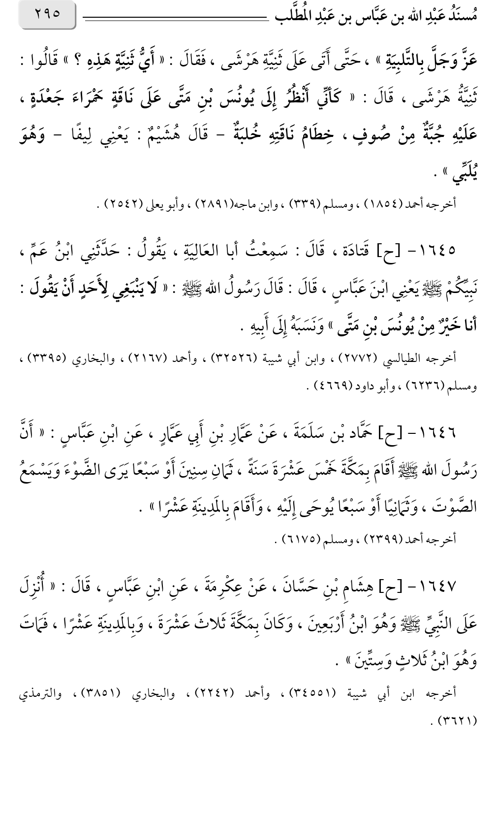 ١٦٤٧ - [ح] هِشَامِ بْنِ حَسَّانَ، عَنْ عِكْرِمَةَ، عَنِ ابْنِ عَبَّاسٍ، قَالَ: «أُنْزِلَ عَلَى النَّبِيِّ صلى الله عليه وسلم وَهُوَ ابْنُ أَرْبَعِينَ، وَكَانَ بِمَكَّةَ ثَلاثَ عَشْرَةَ، وَبِالمَدِينَةِ عَشْرًا، فَمَاتَ وَهُوَ ابْنُ ثَلاثٍ وَسِتِّينَ».