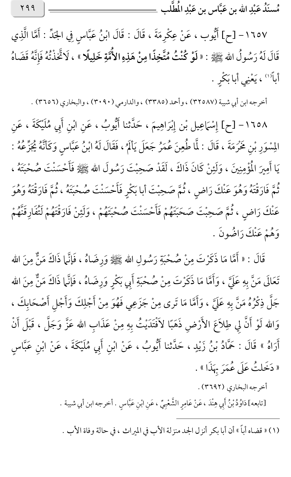 ١٦٥٧ - [ح] أَيُّوب، عَنْ عِكْرِمَةَ، قَالَ: قَالَ ابْنُ عَبَّاسٍ فِي الجَدِّ: أَمَّا الَّذِي قَالَ لَهُ رَسُولُ الله صلى الله عليه وسلم: «لَوْ كُنْتُ مُتَّخِذًا مِنْ هَذِهِ الأُمَّةِ خَلِيلًا» لَاتَّخذْتُهُ فَإِنَّهُ قَضَاهُ، أبًا (¬١)، يَعْنِي أبا بَكْرٍ.