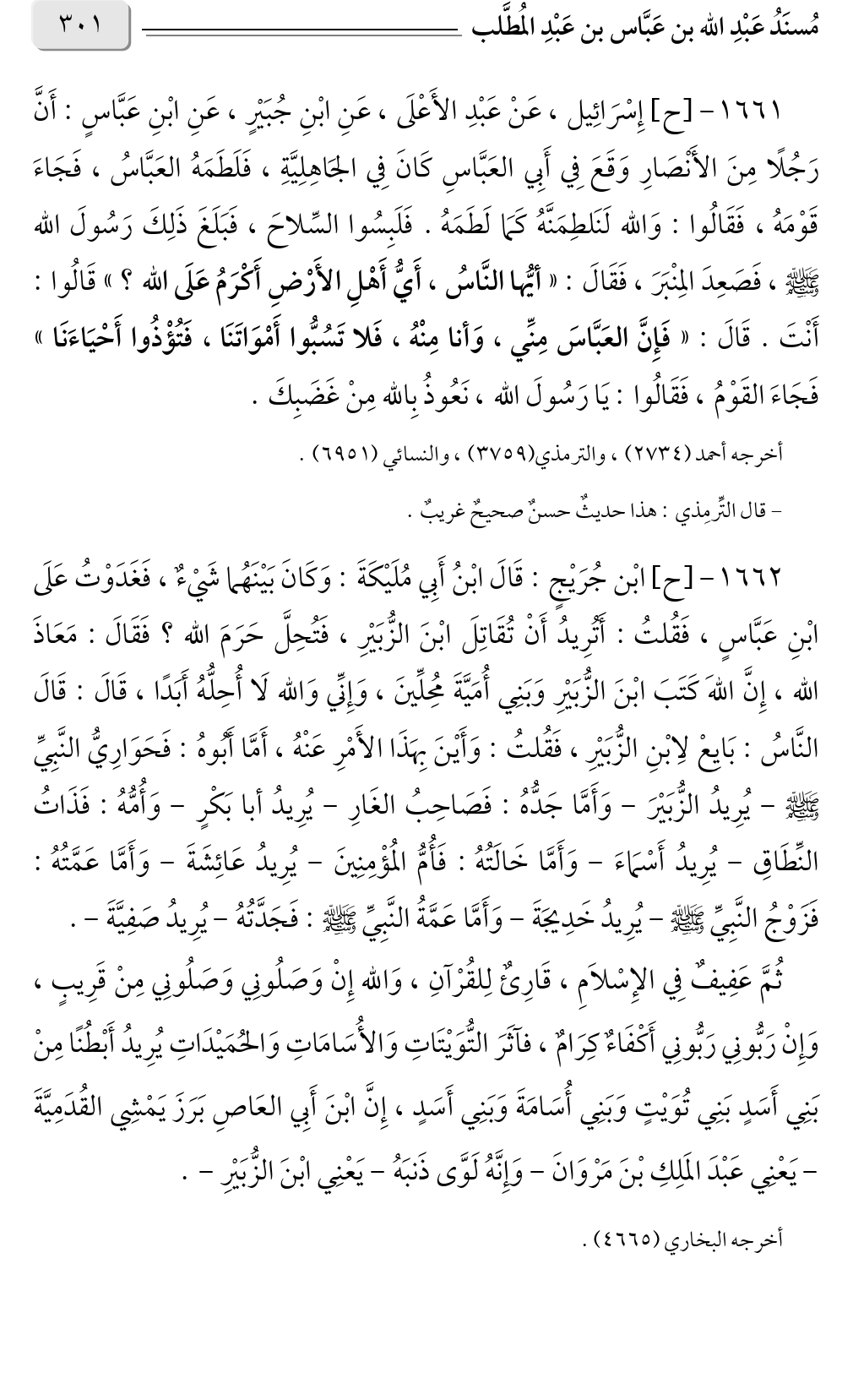 ١٦٦١ - [ح] إِسْرَائِيل، عَنْ عَبْدِ الأَعْلَى، عَنِ ابْنِ جُبَيْرٍ، عَنِ ابْنِ عَبَّاسٍ: أَنَّ رَجُلًا مِنَ الأَنْصَارِ وَقَعَ فِي أَبِي العَبَّاسِ كَانَ فِي الجَاهِلِيَّةِ، فَلَطَمَهُ العَبَّاسُ، فَجَاءَ قَوْمَهُ، فَقَالُوا: وَالله لَنَلطِمَنَّهُ كَمَا لَطَمَهُ. فَلَبِسُوا السِّلاحَ، فَبَلَغَ ذَلِكَ رَسُولَ الله صلى الله عليه وسلم، فَصَعِدَ المِنْبَرَ، فَقَالَ: «أيُّها النَّاسُ، أَيُّ أَهْلِ الأَرْضِ أَكْرَمُ عَلَى الله؟ » قَالُوا: أَنْتَ. قَالَ: «فَإِنَّ العَبَّاسَ مِنِّي، وَأنا مِنْهُ، فَلا تَسُبُّوا أَمْوَاتَنَا، فَتُؤْذُوا أَحْيَاءَنَا» فَجَاءَ القَوْمُ، فَقَالُوا: يَا رَسُولَ الله، نَعُوذُ بِالله مِنْ غَضَبِكَ.