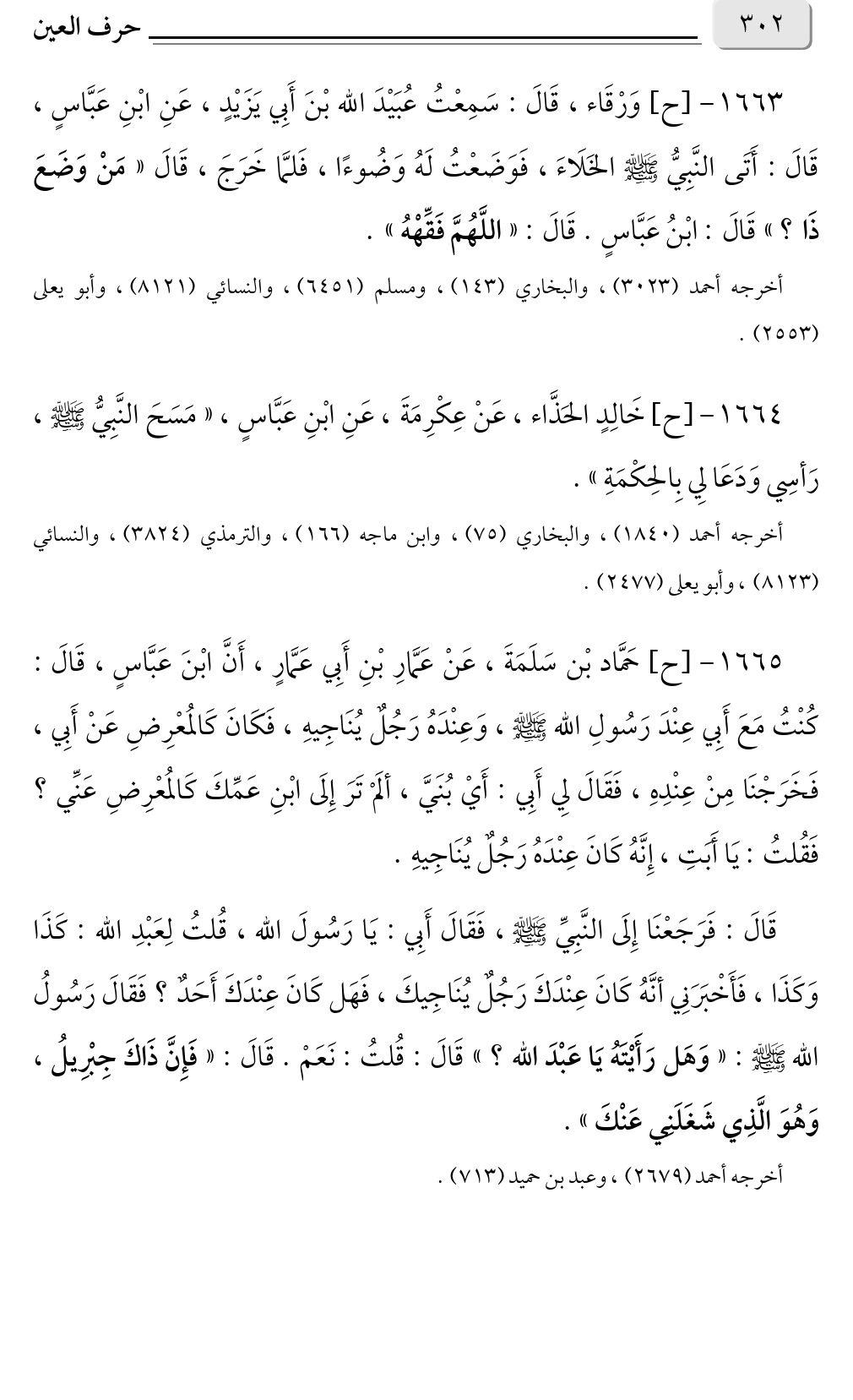 ١٦٦٥ - [ح] حَمَّاد بْن سَلَمَةَ، عَنْ عَمَّارِ بْنِ أَبِي عَمَّارٍ، أَنَّ ابْنَ عَبَّاسٍ، قَالَ: كُنْتُ مَعَ أَبِي عِنْدَ رَسُولِ الله صلى الله عليه وسلم، وَعِنْدَهُ رَجُلٌ يُنَاجِيهِ، فَكَانَ كَالمُعْرِضِ عَنْ أَبِي، فَخَرَجْنَا مِنْ عِنْدِهِ، فَقَالَ لِي أَبِي: أَيْ بُنَيَّ، ألَمْ تَرَ إِلَى ابْنِ عَمِّكَ كَالمُعْرِضِ عَنِّي؟ فَقُلتُ: يَا أَبَتِ، إِنَّهُ كَانَ عِنْدَهُ رَجُلٌ يُنَاجِيهِ.