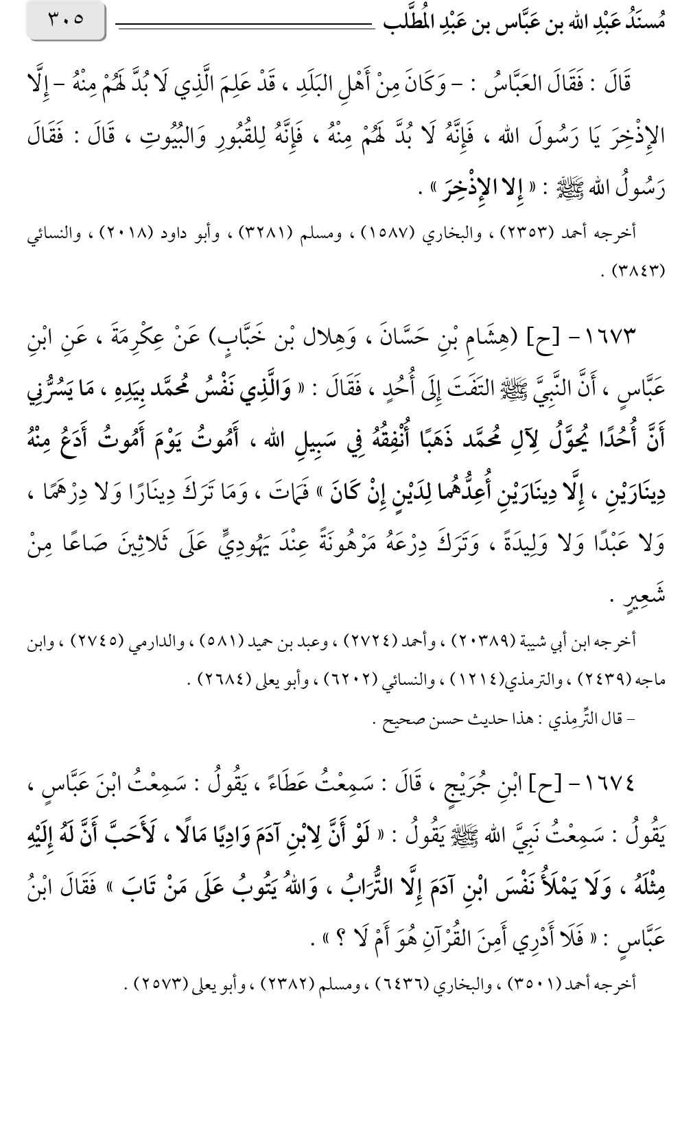 أخرجه ابن أبي شيبة (٢٠٣٨٩)، وأحمد (٢٧٢٤)، وعبد بن حميد (٥٨١)، والدارمي (٢٧٤٥)، وابن ماجة (٢٤٣٩)، والترمذي (١٢١٤)، والنسائي (٦٢٠٢)، وأبو يعلى (٢٦٨٤).