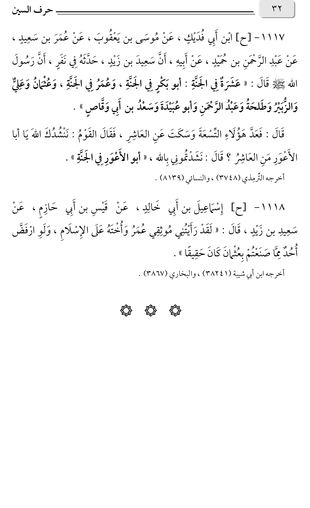 ١١١٧ - [ح] ابْن أَبِي فُدَيْكٍ، عَنْ مُوسَى بن يَعْقُوبَ، عَنْ عُمَرَ بن سَعِيدٍ، عَنْ عَبْدِ الرَّحْمَنِ بن حُمَيْدٍ، عَنْ أَبِيهِ، أَنَّ سَعِيدَ بن زَيْدٍ، حَدَّثَهُ فِي نَفَرٍ، أَنَّ رَسُولَ الله صلى الله عليه وسلم قَالَ: «عَشَرَةٌ فِي الجَنَّةِ: أبو بَكْرٍ فِي الجَنَّةِ، وَعُمَرُ فِي الجَنَّةِ، وَعُثْمَانُ وَعَلِيٌّ وَالزُّبَيْرُ وَطَلحَةُ وَعَبْدُ الرَّحْمَنِ وَأبو عُبَيْدَةَ وَسَعْدُ بن أَبِي وَقَّاصٍ».