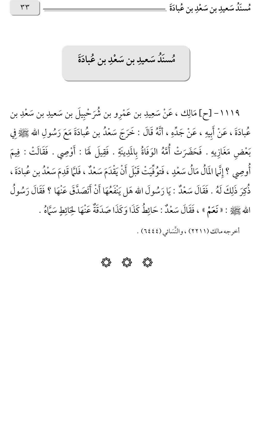 ١١١٩ - [ح] مَالِك، عَنْ سَعِيدِ بن عَمْرِو بن شُرَحْبِيلَ بن سَعيدِ بن سَعْدِ بن عُبادَةَ، عَنْ أَبِيهِ، عَنْ جَدِّهِ، أنَّهُ قَالَ: خَرَجَ سَعْدُ بن عُبادَةَ مَعَ رَسُولِ الله صلى الله عليه وسلم فِي بَعْضِ مَغَازِيهِ. فَحَضَرَتْ أُمَّهُ الوَفَاةُ بِالمَدِينَةِ. فَقِيلَ لَهَا: أَوْصِي. فَقَالَتْ: فِيمَ أُوصِي؟ إِنَّما المَالُ مَالُ سَعْدٍ، فَتوُفِّيَتْ قَبْلَ أَنْ يَقْدَمَ سَعْدٌ، فَلمَّا قَدِمَ سَعْدُ بن عُبادَةَ، ذُكِرَ ذَلِكَ لَهُ. فَقَالَ سَعْدٌ: يَا رَسُولَ الله هَل يَنْفَعُهَا أَنْ أَتَصَدَّقَ عَنْهَا؟ فَقَالَ رَسُولُ الله صلى الله عليه وسلم: «نَعَمْ»، فَقَالَ سَعْدٌ: حَائِطُ كَذَا وَكَذَا صَدَقَةٌ عَنْهَا لحَائِطٍ سَمَّاهُ.