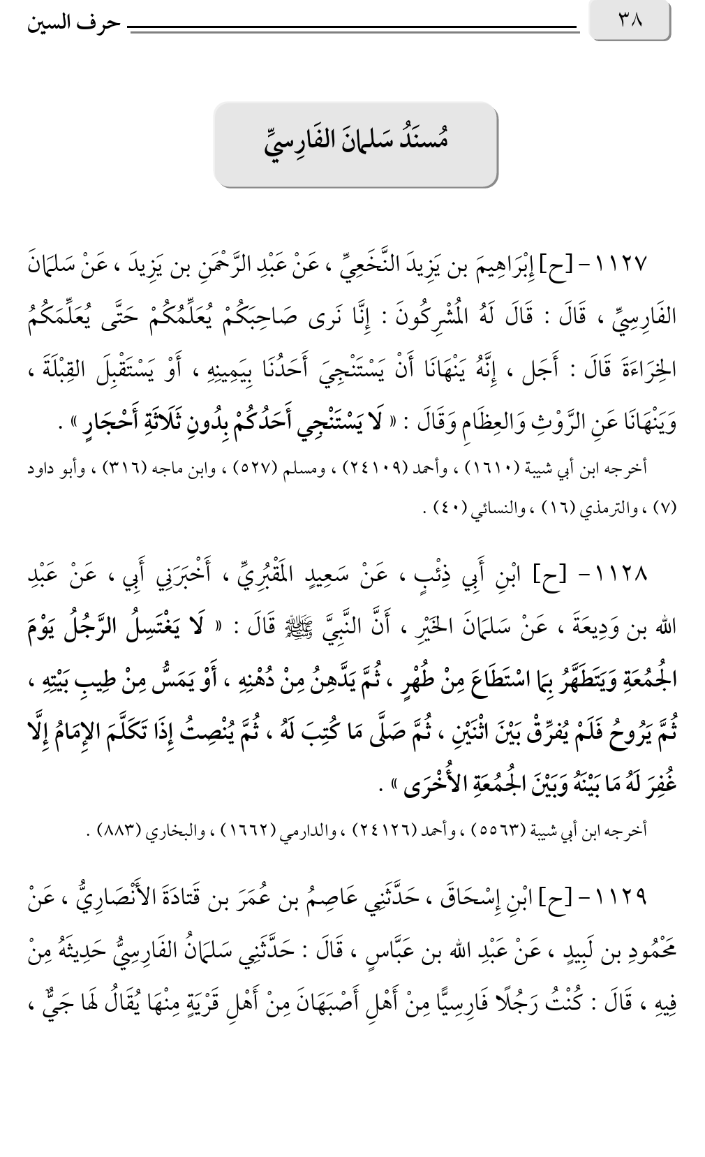 ١١٢٧ - [ح] إِبْرَاهِيمَ بن يَزِيدَ النَّخَعِيِّ، عَنْ عَبْدِ الرَّحْمَنِ بن يَزِيدَ، عَنْ سَلمَانَ الفَارِسِيِّ، قَالَ: قَالَ لَهُ المُشْرِكُونَ: إِنَّا نَرى صَاحِبَكُمْ يُعَلِّمُكُمْ حَتَّى يُعَلِّمَكُمُ الخِرَاءَةَ قَالَ: أَجَل، إِنَّهُ يَنْهَانَا أَنْ يَسْتَنْجِيَ أَحَدُنَا بِيَمِينِهِ، أَوْ يَسْتَقْبِلَ القِبْلَةَ، وَيَنْهَانَا عَنِ الرَّوْثِ وَالعِظَامِ وَقَالَ: «لَا يَسْتَنْجِي أَحَدُكُمْ بِدُونِ ثَلَاثَةِ أَحْجَارٍ».