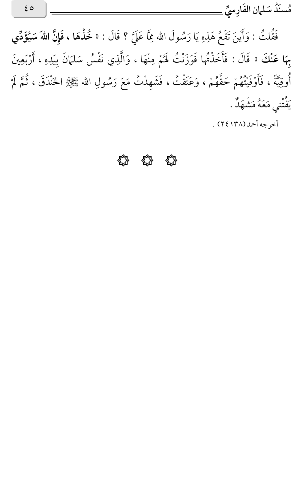 فَقُلتُ: وَأَيْنَ تَقَعُ هَذِهِ يَا رَسُولَ الله مِمَّا عَلَيَّ؟ قَالَ: «خُذْهَا، فَإِنَّ اللهَ سَيُؤَدِّي بِهَا عَنْكَ» قَالَ: فَأَخَذْتُها فَوَزَنْتُ لَهُمْ مِنْهَا، وَالَّذِي نَفْسُ سَلمَانَ بِيَدِهِ، أَرْبَعِينَ أُوقِيَّةً، فَأَوْفَيْتُهُمْ حَقَّهُمْ، وَعَتَقْتُ، فَشَهِدْتُ مَعَ رَسُولِ الله صلى الله عليه وسلم الخَنْدَقَ، ثُمَّ لَمْ يَفُتْني مَعَهُ مَشْهَدٌ.
