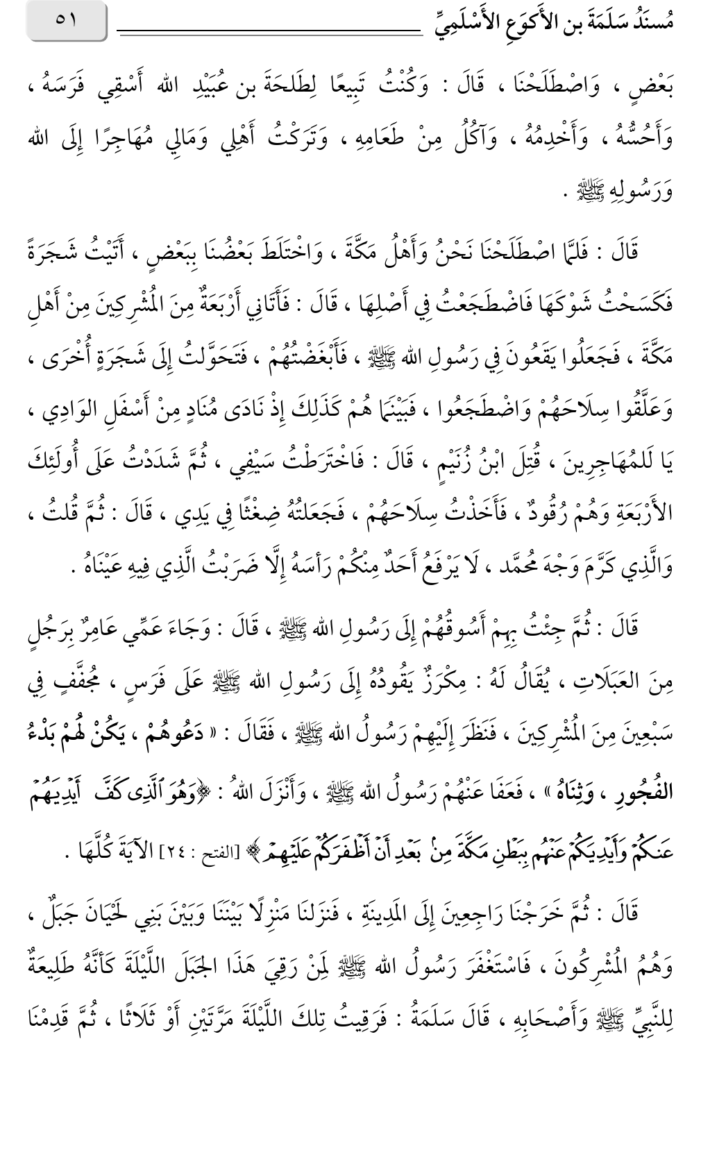 قَالَ: فَلمَّا اصْطَلَحْنَا نَحْنُ وَأَهْلُ مَكَّةَ، وَاخْتَلَطَ بَعْضُنَا بِبَعْضٍ، أَتَيْتُ شَجَرَةً فَكَسَحْتُ شَوْكَهَا فَاضْطَجَعْتُ فِي أَصْلِهَا، قَالَ: فَأَتَانِي أَرْبَعَةٌ مِنَ المُشْرِكِينَ مِنْ أَهْلِ مَكَّةَ، فَجَعَلُوا يَقَعُونَ فِي رَسُولِ الله صلى الله عليه وسلم، فَأَبْغَضْتُهُمْ، فَتَحَوَّلتُ إِلَى شَجَرَةٍ أُخْرَى، وَعَلَّقُوا سِلَاحَهُمْ وَاضْطَجَعُوا، فَبَيْنَمَا هُمْ كَذَلِكَ إِذْ نَادَى مُنَادٍ مِنْ أَسْفَلِ الوَادِي، يَا لَلمُهَاجِرِينَ، قُتِلَ ابْنُ زُنَيْمٍ، قَالَ: فَاخْتَرَطْتُ سَيْفِي، ثُمَّ شَدَدْتُ عَلَى أُولَئِكَ الأَرْبَعَةِ وَهُمْ رُقُودٌ، فَأَخَذْتُ سِلَاحَهُمْ، فَجَعَلتُهُ ضِغْثًا فِي يَدِي، قَالَ: ثُمَّ قُلتُ، وَالَّذِي كَرَّمَ وَجْهَ مُحمَّد، لَا يَرْفَعُ أَحَدٌ مِنْكُمْ رَأسَهُ إِلَّا ضَرَبْتُ الَّذِي فِيهِ عَيْنَاهُ.