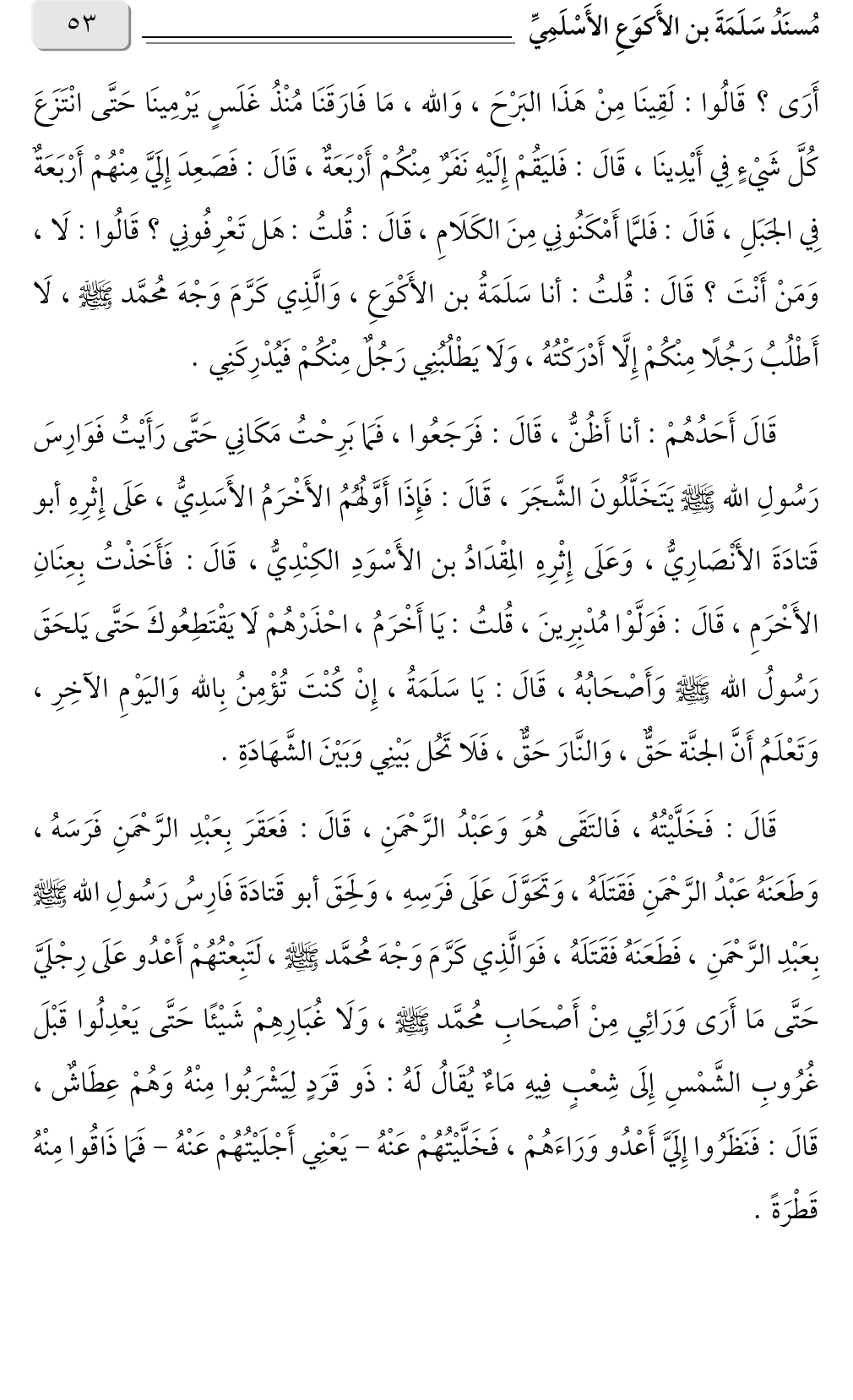 قَالَ أَحَدُهُمْ: أنا أَظُنُّ، قَالَ: فَرَجَعُوا، فَمَا بَرِحْتُ مَكَانِي حَتَّى رَأَيْتُ فَوَارِسَ رَسُولِ الله صلى الله عليه وسلم يَتَخَلَّلُونَ الشَّجَرَ، قَالَ: فَإِذَا أَوَّلُهُمُ الأَخْرَمُ الأَسَدِيُّ، عَلَى إِثْرِهِ أبو قَتادَةَ الأَنْصَارِيُّ، وَعَلَى إِثْرِهِ المِقْدَادُ بن الأَسْوَدِ الكِنْدِيُّ، قَالَ: فَأَخَذْتُ بِعِنَانِ الأَخْرَمِ، قَالَ: فَوَلَّوْا مُدْبِرِينَ، قُلتُ: يَا أَخْرَمُ، احْذَرْهُمْ لَا يَقْتَطِعُوكَ حَتَّى يَلحَقَ رَسُولُ الله صلى الله عليه وسلم وَأَصْحَابُهُ، قَالَ: يَا سَلَمَةُ، إِنْ كُنْتَ تُؤْمِنُ بِالله وَاليَوْمِ الآخِرِ، وَتَعْلَمُ أَنَّ الجنَّة حَقٌّ، وَالنَّارَ حَقٌّ، فَلَا تَحُل بَيْنِي وَبَيْنَ الشَّهَادَةِ.