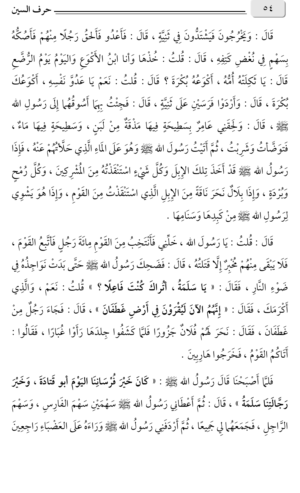 قَالَ: وَيَخْرُجُونَ فَيَشْتَدُّونَ فِي ثَنِيَّةٍ، قَالَ: فَأَعْدُو فَأَلحقُ رَجُلًا مِنْهُمْ فَأَصُكُّهُ بِسَهْمٍ فِي نُغْضِ كَتِفِهِ، قَالَ: قُلتُ: خُذْهَا وَأنا ابْنُ الأَكْوَعِ وَاليَوْمُ يَوْمُ الرُّضَّعِ قَالَ: يَا ثَكِلَتْهُ أُمُّهُ، أَكْوَعُهُ بُكْرَةَ؟ قَالَ: قُلتُ: نَعَمْ يَا عَدُوَّ نَفْسِهِ، أَكْوَعُكَ بُكْرَةَ، قَالَ: وَأَرْدَوْا فَرَسَيْنِ عَلَى ثَنِيَّةٍ، قَالَ: فَجِئْتُ بِهِمَا أَسُوقُهُما إِلَى رَسُولِ الله صلى الله عليه وسلم، قَالَ: وَلحَقَنِي عَامِرٌ بِسَطِيحَةٍ فِيهَا مَذْقَةٌ مِنْ لَبَنٍ، وَسَطِيحَةٍ فِيهَا مَاءٌ، فَتوَضَّأتُ وَشَرِبْتُ، ثُمَّ أَتَيْتُ رَسُولَ الله صلى الله عليه وسلم وَهُوَ عَلَى المَاءِ الَّذِي حَلَّأتُهُمْ عَنْهُ، فَإِذَا رَسُولُ الله صلى الله عليه وسلم قَدْ أَخَذَ تِلكَ الإِبِلَ وَكُلَّ شَيْءٍ اسْتَنْقَذْتُهُ مِنَ المُشْرِكِينَ، وَكُلَّ رُمْحٍ وَبُرْدَةٍ، وَإِذَا بِلَالٌ نَحَرَ نَاقَةً مِنَ الإِبِلِ الَّذِي اسْتَنْقَذْتُ مِنَ القَوْمِ، وَإِذَا هُوَ يَشْوِي لِرَسُولِ الله صلى الله عليه وسلم مِنْ كَبِدِهَا وَسَنَامِهَا.