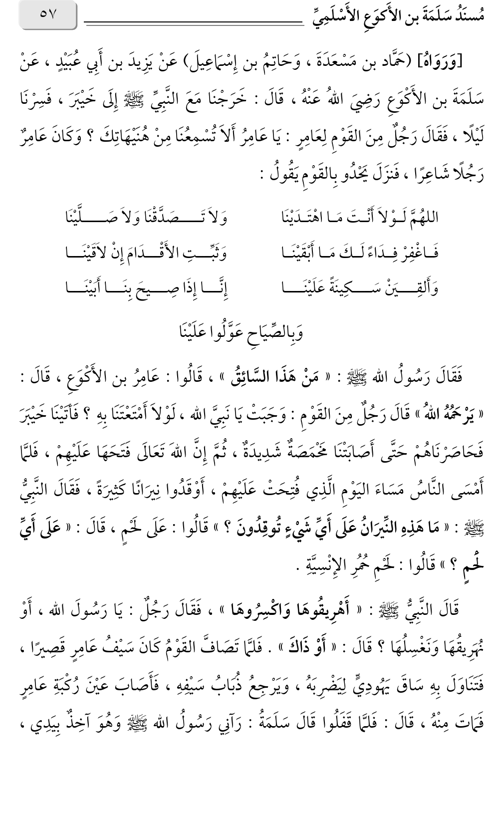 قَالَ النَّبِيُّ صلى الله عليه وسلم: «أَهْرِيقُوهَا وَاكْسِرُوهَا» فَقَالَ رَجُلٌ: يَا رَسُولَ الله، أَوْ، نُهَرِيقُهَا وَنَغْسِلُهَا؟ قَالَ: «أَوْ ذَاكَ» فَلمَّا تَصَافَّ القَوْمُ كَانَ سَيْفُ عَامِرٍ قَصِيرًا، . فَتَنَاوَلَ بِهِ سَاقَ يَهُودِيٍّ لِيَضْرِبَهُ، وَيَرْجِعُ ذُبَابُ سَيْفِهِ، فَأَصَابَ عَيْنَ رُكْبَةِ عَامِرٍ فَمَاتَ مِنْهُ، قَالَ: فَلمَّا قَفَلُوا قَالَ سَلَمَةُ: رَآنِي رَسُولُ الله صلى الله عليه وسلم وَهُوَ آخِذٌ بِيَدِي،