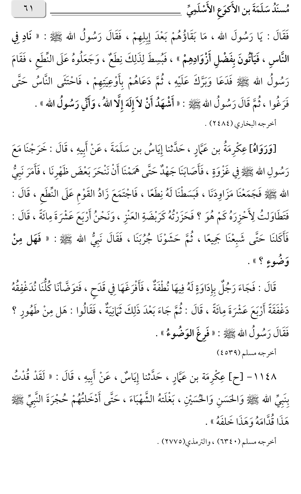 [وَرَوَاهُ] عِكْرِمَةُ بن عَمَّارٍ، حَدَّثنا إِيَاسُ بن سَلَمَةَ، عَنْ أَبِيهِ، قَالَ: خَرَجْنَا مَعَ رَسُولِ الله صلى الله عليه وسلم فِي غَزْوَةٍ، فَأَصَابَنَا جَهْدٌ حَتَّى هَمَمْنَا أَنْ نَنْحَرَ بَعْضَ ظَهْرِنَا، فَأَمَرَ نَبِيُّ الله صلى الله عليه وسلم فَجَمَعْنَا مَزَاوِدَنَا، فَبَسَطْنَا لَهُ نِطَعًا، فَاجْتَمَعَ زَادُ القَوْمِ عَلَى النِّطَعِ، قَالَ: فَتَطَاوَلتُ لِأَحْزِرَهُ كَمْ هُوَ؟ فَحَزَرْتُهُ كَرَبْضَةِ العَنْزِ، وَنَحْنُ أَرْبَعَ عَشْرَةَ مِائَةً، قَالَ: فَأَكَلنَا حَتَّى شَبِعْنَا جَمِيعًا، ثُمَّ حَشَوْنَا جُرُبَنَا، فَقَالَ نَبِيُّ الله صلى الله عليه وسلم: «فَهَل مِنْ وَضُوءٍ؟ ».